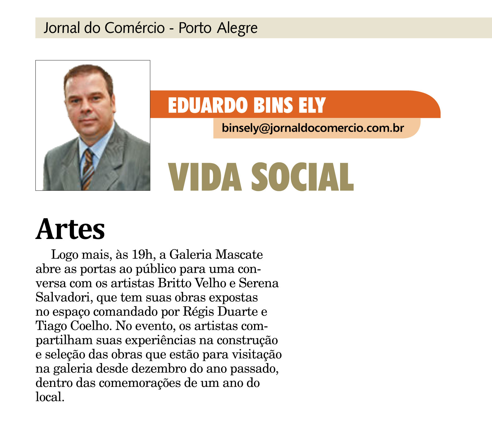 No evento, os artistas compartilham suas experiências na construção e seleção das obras que estão para visitação na galeria desde dezembro do ano passado, dentro das comemorações de um ano do local. Dez desenhos de Britto mais uma série de cartazes numerados com as obras do pintor, escultor e gravurista fazem parte da seleção. Serena encerra em fevereiro a I Bolsa de Residência Artística da Galeria Mascate, onde trabalhou desde agosto de 2012. A fotógrafa italiana fará seu depoimento sobre a experiência e comentará o resultado que pode ser conferido na exposição TODO SOBRE MI VIDA > SOBRE TODO MI VIDA.