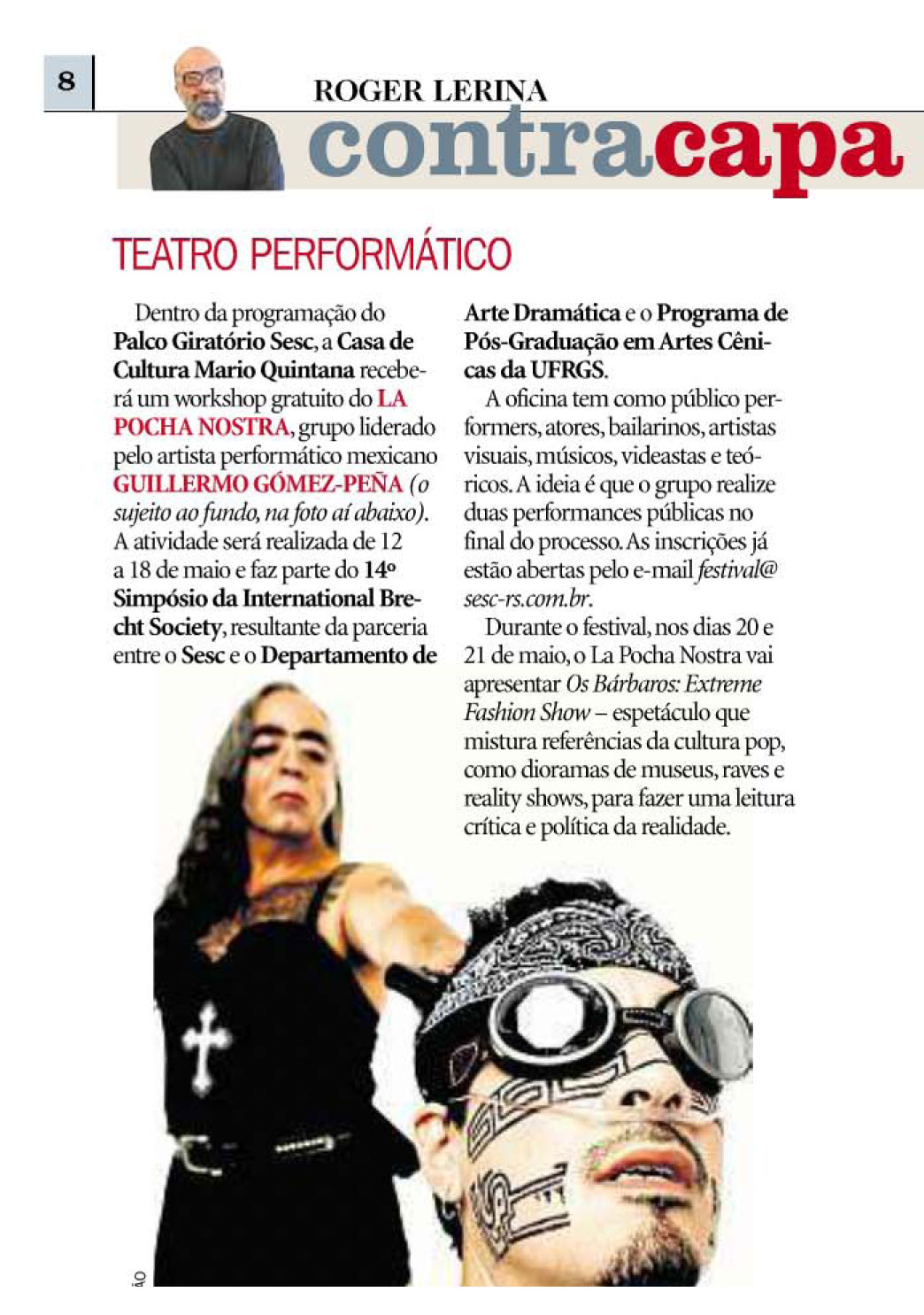 A oficina “Exercises for Rebel Artists” do coletivo La Pocha Nostra é destaque na Contracapa de hoje. A atividade integra o 14º Simpósio da International Brecht Society, durante os dias 20 e 23 de maio, em Porto Alegre