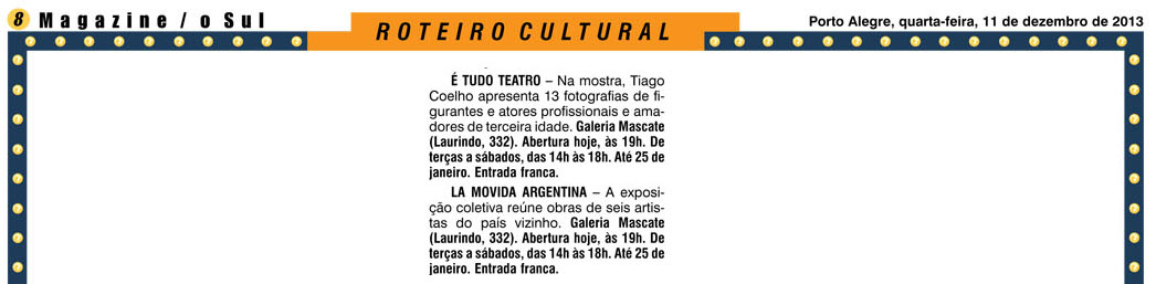 Inauguram no dia 11 de dezembro duas novas exposições da Galeria Mascate. “La Movida Argentina” traz seis artistas do país vizinho. Tiago Coelho começou cedo fazendo vídeos caseiros na infância tendo os primos no elenco. Pensou que seria ator, mas logo percebeu que o encanto estava atrás das câmeras. Formou-se então em cinema e já no início do curso percebeu que sua vocação estava na fotografia. Durante a graduação apaixonou-se pela fotografia analógica documental. Na Escola de Fotografia de Madri descobriu o digital no “documentário contemporâneo” e o quanto gostava de fazer parte e inserir-se no universo dos fotografados. Na volta ao Brasil driblou o preconceito que tinha com as fotos de moda e foi além, trazendo seu olhar documental para os ensaios que começou a produzir para estilistas. Veio o sucesso do documentário fotográfico Dona Ana, com individuais em espaços no Brasil e Argentina.