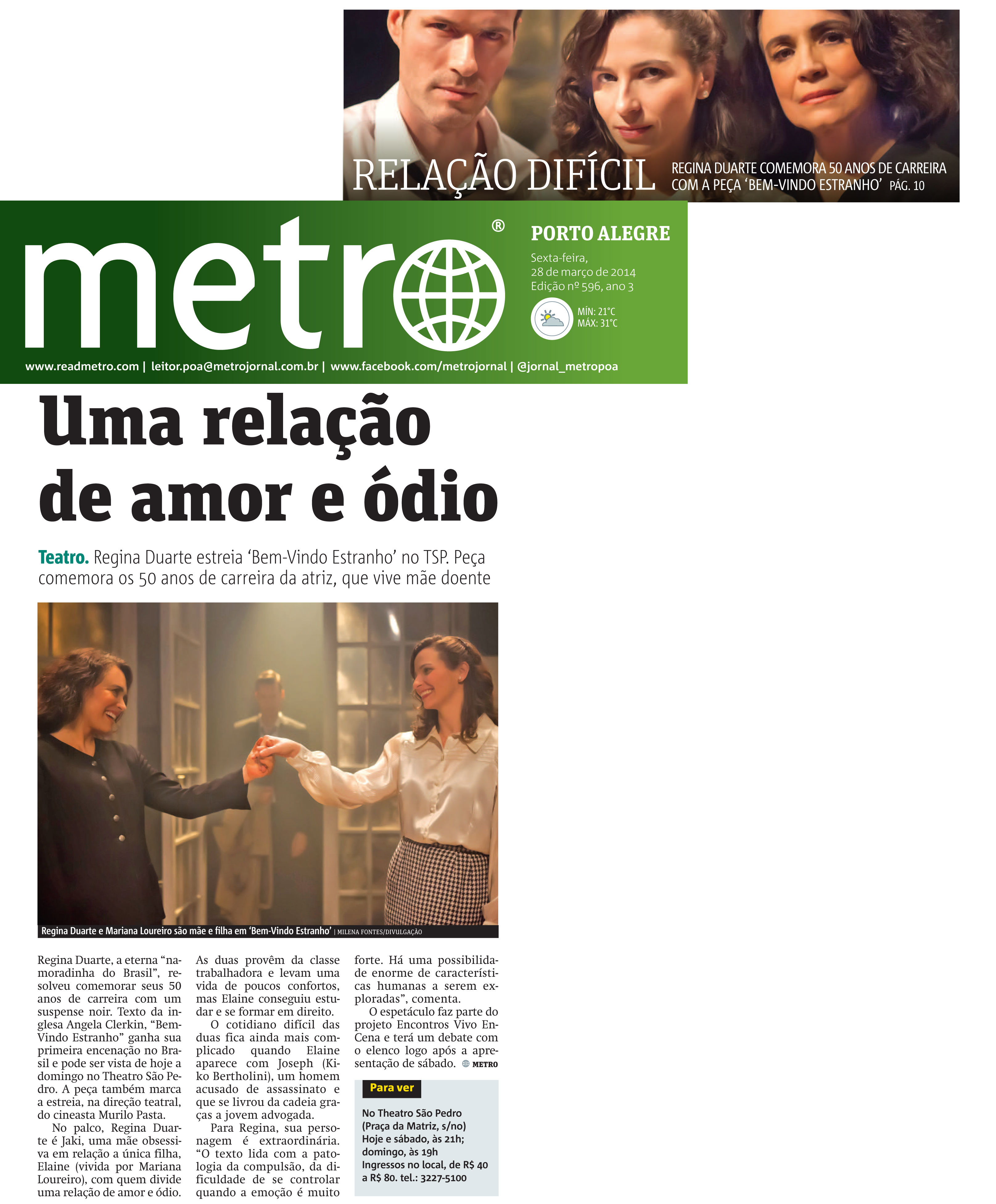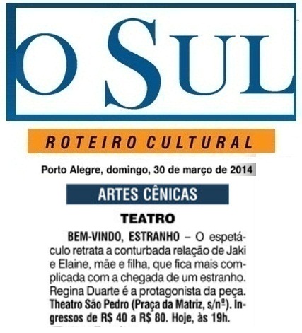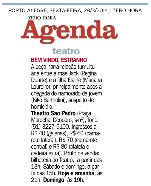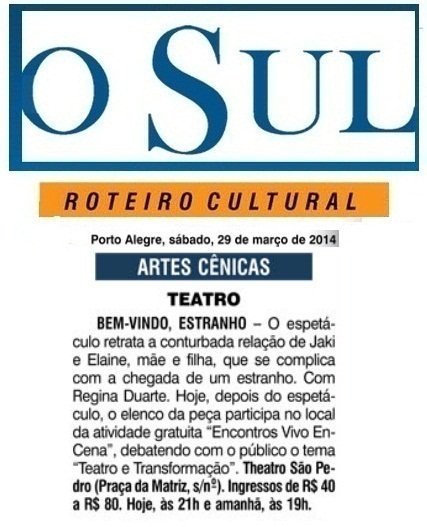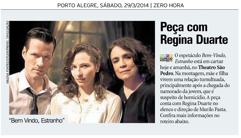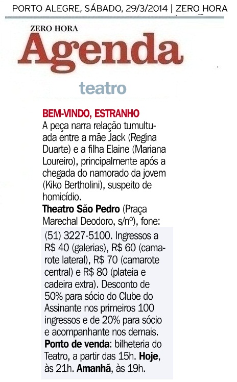 A primeira edição de 2014 em Porto Alegre do projeto Encontros Vivo EnCena acontece no dia 29 de março, no Theatro São Pedro. O debate “Teatro e Transformação”, mediado por Expedito Araújo, curador artístico do Vivo EnCena conta com a participação dos atores Regina Duarte, Kiko Bertholini e Mariana Loureiro que integram o elenco do espetáculo “Bem-Vindo, Estranho”.