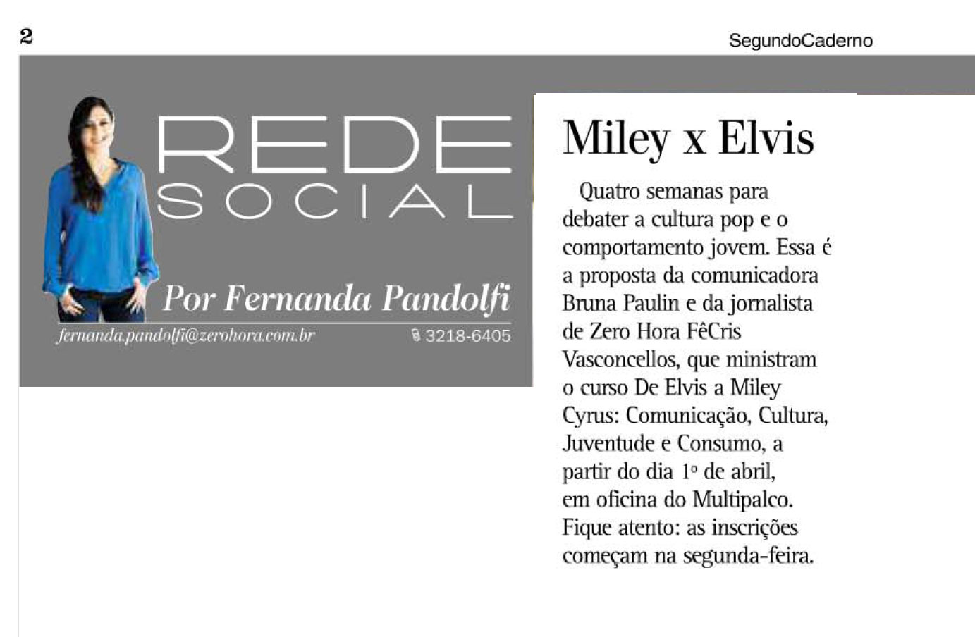 Contar a história do surgimento do jovem como mercado consumidor através da cultura pop. Este é o objetivo do curso “De Elvis a Miley Cyrus: comunicação, cultura, juventude e consumo”, ministrado pelas jornalistas Bruna Paulin e FêCris Vasconcellos. Em sua segunda edição, o curso muda seu nome, marcando a atualização dos conteúdos desde sua primeira edição, em setembro de 2012. “Acreditamos que para marcar a atualidade dos conteúdos, não podíamos mais utilizar a figura de Justin Bieber, mas sim, destacar a artista jovem mais em voga no momento, Miley Cyrus”, revelam.