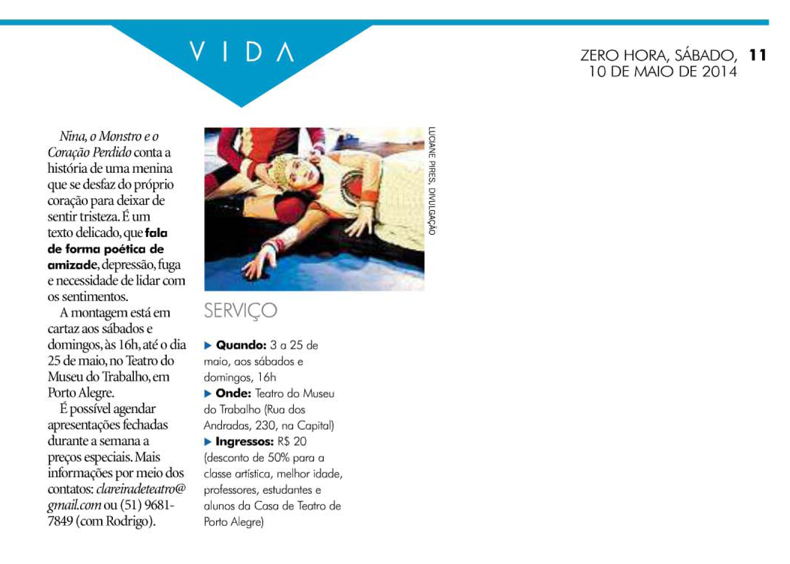 Lúcia Bendati, Na mídia, Nina o monstro e o coração perdido, Teatro do Museu do Trabalho, Vida, Zero Hora