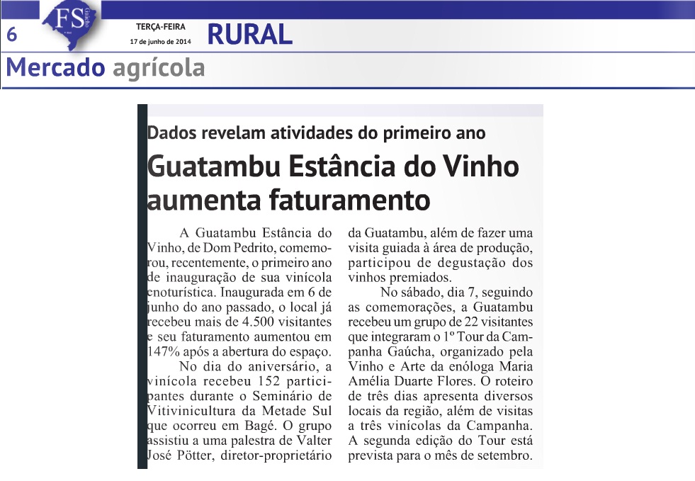 No dia 07, seguindo as comemorações, a Guatambu recebeu um grupo de 22 visitantes que integraram o 1º Tour da Campanha Gaúcha, organizado pela Vinho e Arte da enóloga Maria Amélia Duarte Flores. O roteiro de três dias apresenta diversos locais da região, além de visitas a três vinícolas da Campanha. A segunda edição do Tour está prevista para o mês de setembro.