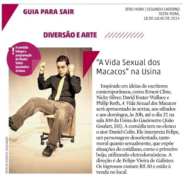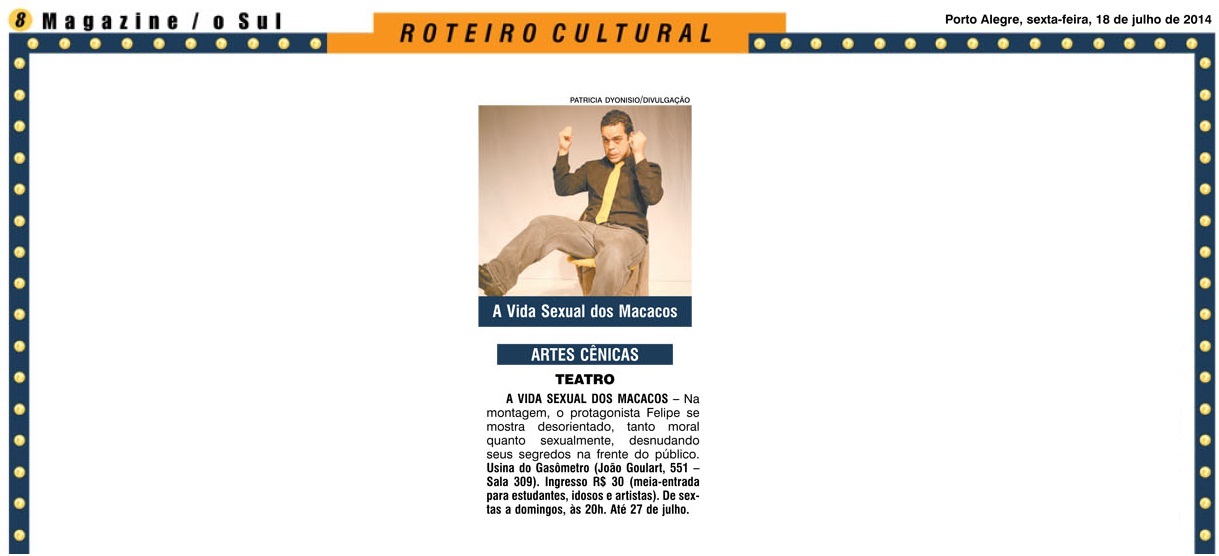 A comédia “A Vida Sexual dos Macacos” tem apresentações na sala 309 da Usina do Gasômetro nos dias 18, 19, 20, 25, 26 e 27 de julho, às 20h. A montagem integra a programação da Mostra Sarcáustico 10 Anos, que segue até final de agosto.