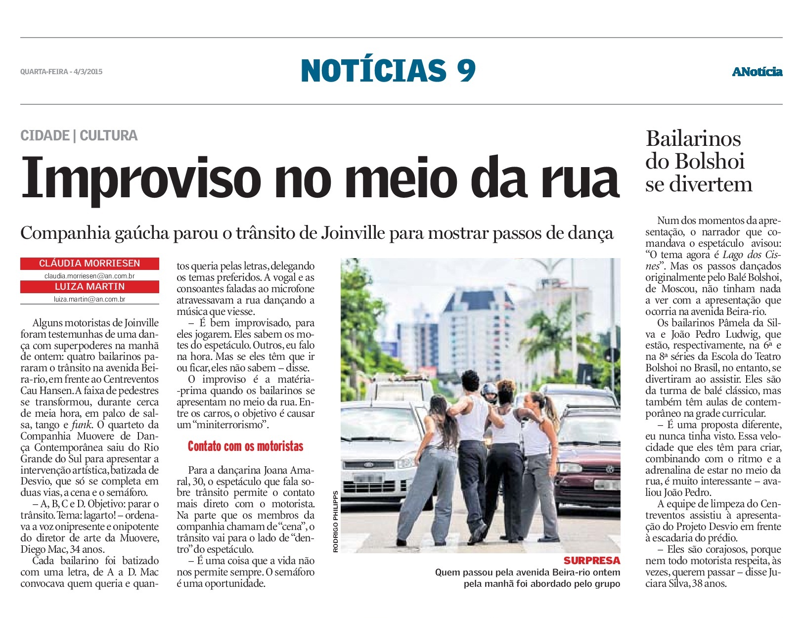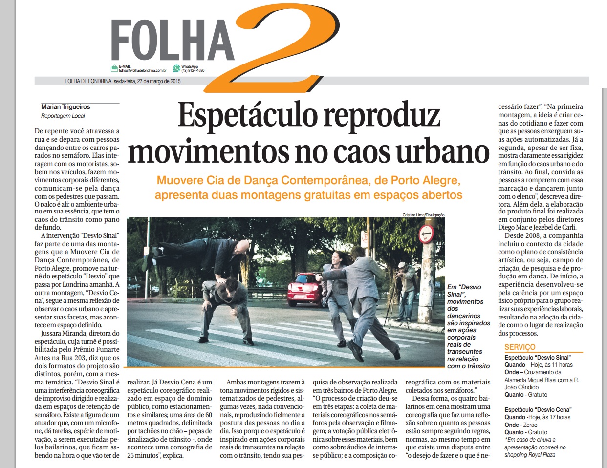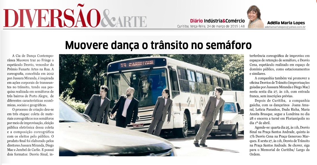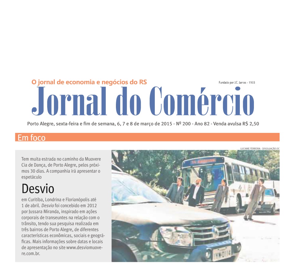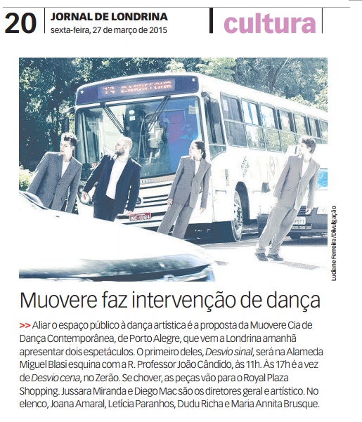 A Muovere Cia de Dança Contemporânea encerra no dia 01 de abril a turnê do espetáculo “Desvio” que passou por Joinville, Curitiba, Londrina e chega a Florianópolis nesta quarta-feira. O espetáculo foi concebido em 2012 por Jussara Miranda, inspirado em ações corporais ordinárias de transeuntes na relação com o trânsito, tendo sua pesquisa realizada em três bairros de Porto Alegre, RS, de diferentes características econômicas, sociais e geográficas.