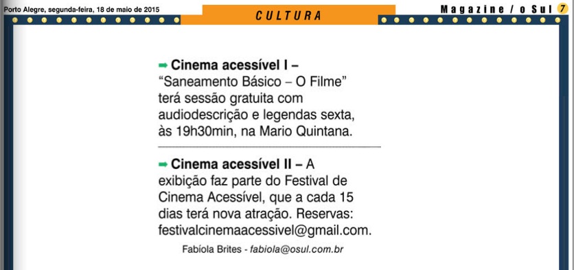 Casa de Cinema de Porto Alegre, Casa de Cultura Mario Quintana, festival de cinema acessível, Jorge Furtado, Na mídia, O Sul, saneamento básico o filme