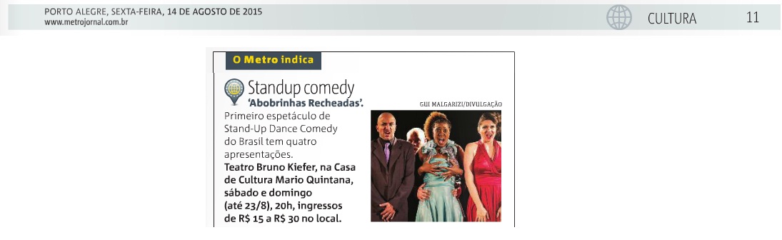 Abobrinhas Recheadas, Casa de Cultura Mario Quintana, Correio do Povo, Macarenando Dance Concept, Metro, Na mídia, Teatro Bruno Kiefer, Zero Hora