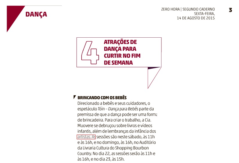 Livraria Cultura, Metro, Muovere Cia de Dança Contemporânea, Na mídia, Tóin - dança para bebês, Zero Hora