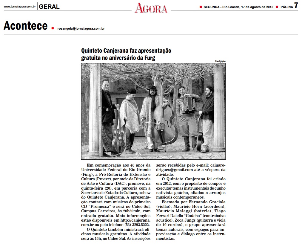 agora, Na mídia, Quinteto Canjerana, Rio Grande, Teatro Cidec-Sul