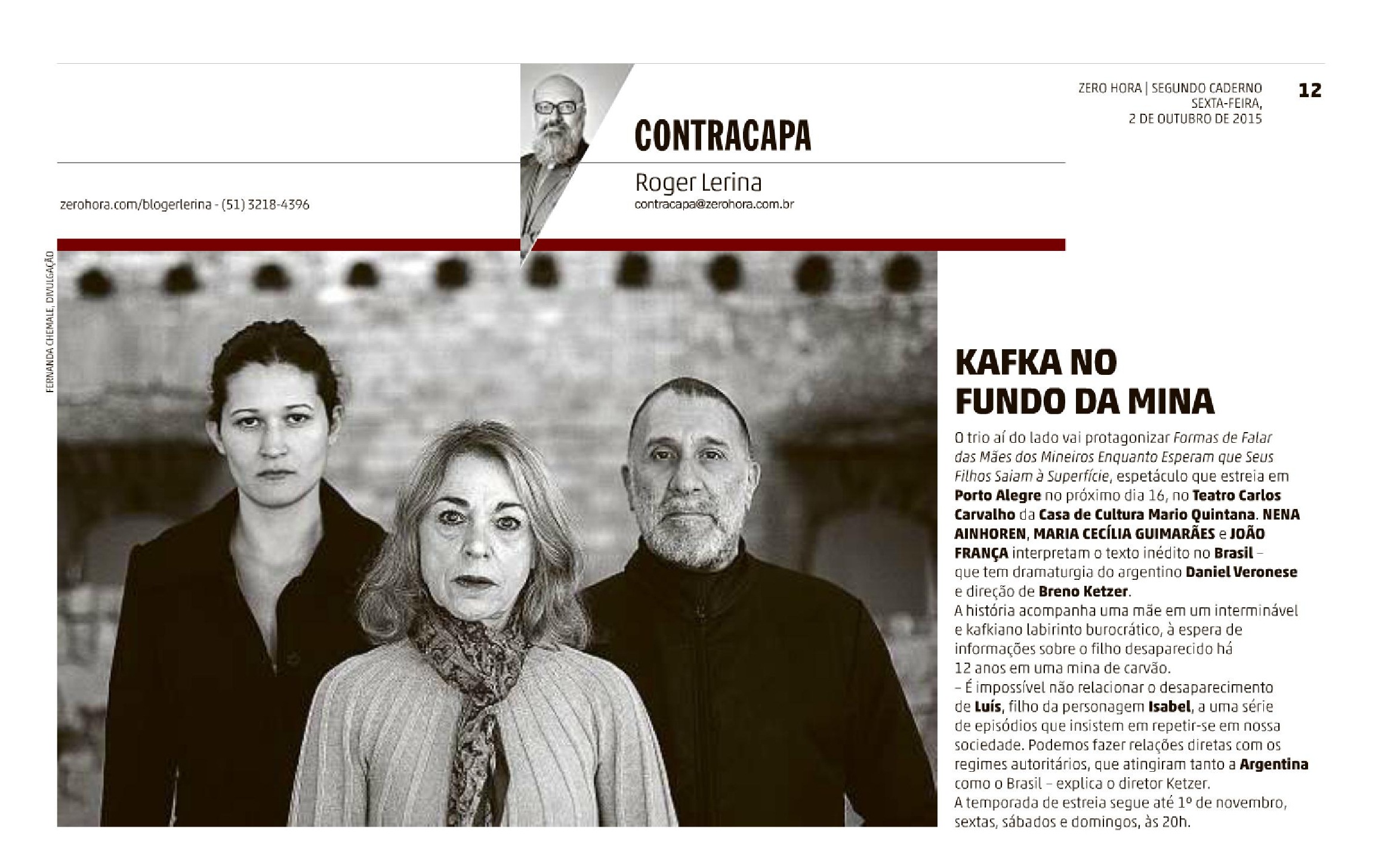 Casa de Cultura Mario Quintana, Contracapa, Formas de Falar das Mães dos Mineiros Enquanto Esperam que Seus Filhos Saiam à Superfície, Na mídia, Roger Lerina, teatro carlos de carvalho, Zero Hora