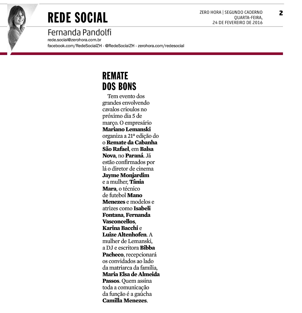 O evento, que sempre reúne convidados ilustres que viajam especialmente para prestigiar o evento como o diretor Jayme Monjardim e a esposa Tânia Mara, o técnico Mano Menezes, e as modelos Isabeli Fontana, Fernanda Vasconcellos, Karina Bacchi e Luize Altenhofen, entre outros nomes. O Remate inicia às 21h, com transmissão ao vivo pelo Canal Rural e o martelo fica a cargo da Trajano e Silva Remates.
