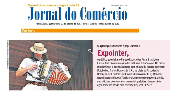 De 27 de agosto a 01 de setembro o público que visitar a Expointer poderá conferir uma série de atividades gratuitas que integram a programação do I Encontro de Arte Tradicional. Realizado pela Idealize com o apoio da ABCCC – Associação Brasileira de Criadores de Cavalos Crioulos através da Lei Federal de Incentivo à Cultura – Lei Rouanet, o projeto tem como objetivo promover ações culturais gratuitas para valorizar e difundir a cultura rio-grandense através da música.