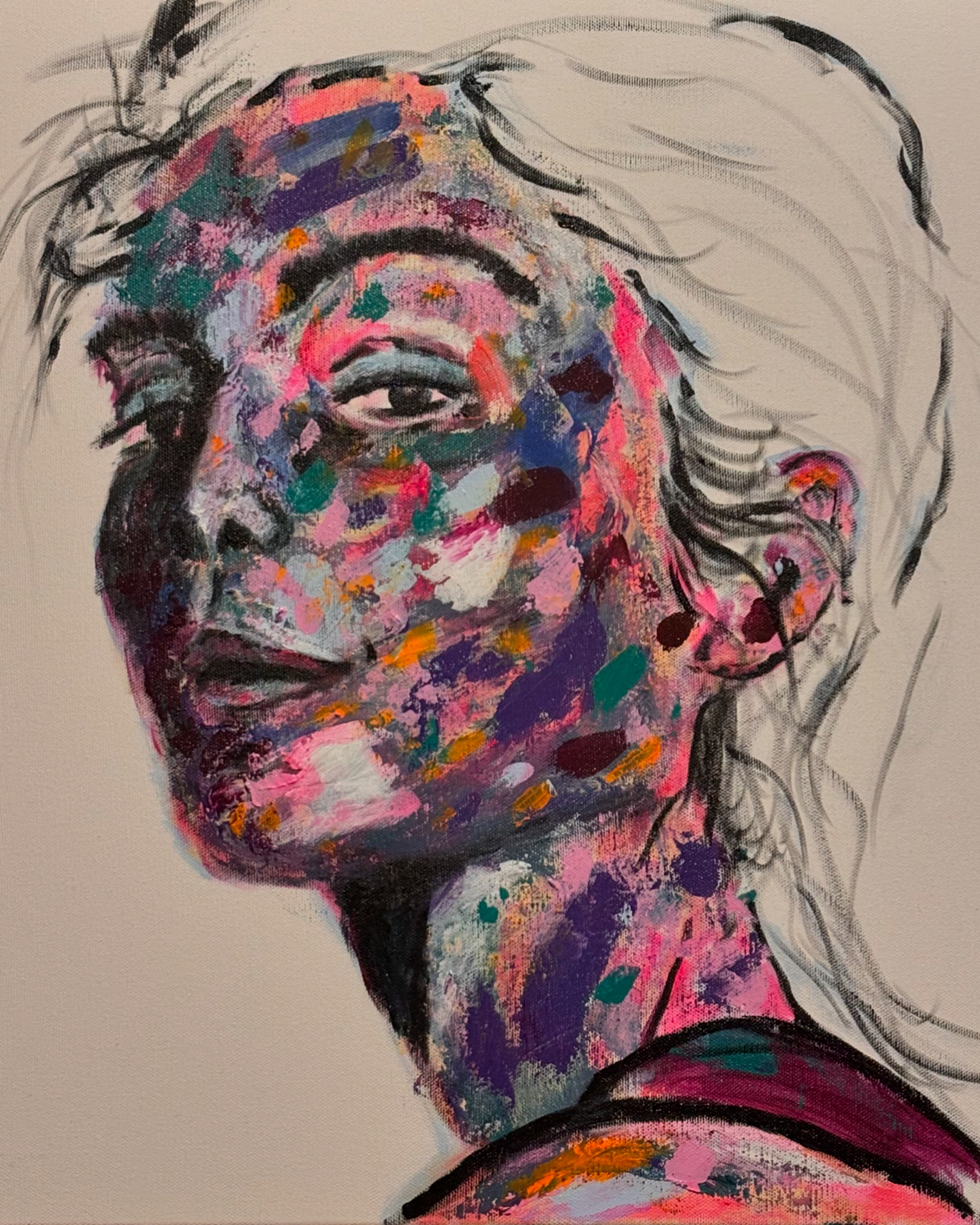 Inspirado pela visceralidade de Francis Bacon, pela melancolia de Schiele e pelos retratos brutalizados de Iberê Camargo, Thiago explora a angústia da fragmentação do “eu”. Assim como Iberê, para quem o autorretrato não era um espelho de Narciso, mas um encontro com o terror do outro, Thiago se coloca em constante oposição a esse outro “eu”. Esse processo de “autoconfronto” é visível em suas obras, onde as figuras solitárias — sejam elas reais ou imaginadas — revelam não apenas uma busca estética, mas uma tentativa de dominar o “outro” que habita dentro de si.