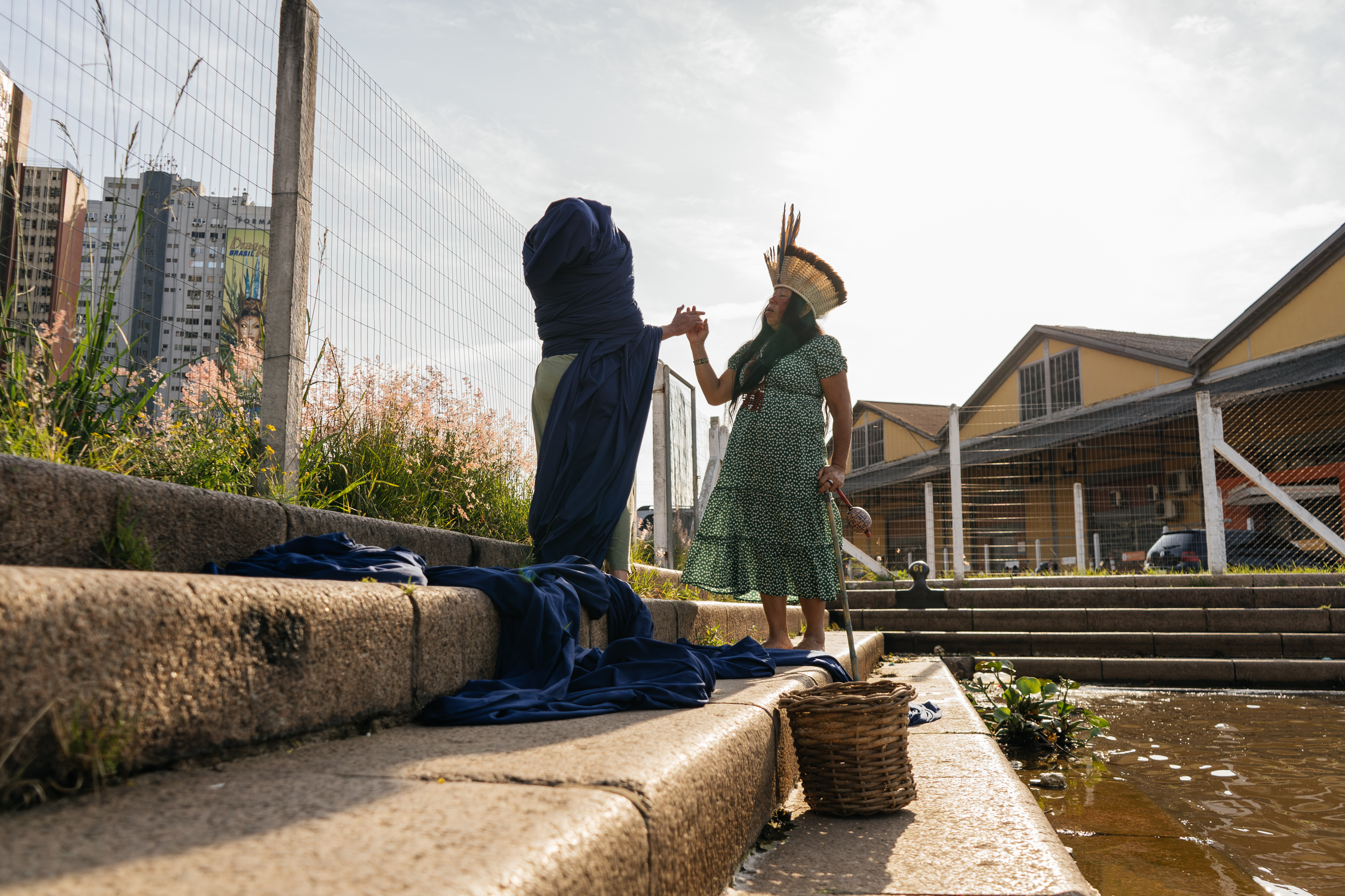 Apesar do silêncio em relação a presença do Povo Kaingang nas narrativas de transformação de Pó Oré, hoje conhecida como Porto Alegre, a artista e antropóloga Geórgia Macedo, ao pesquisar sobre o porto da cidade, encontrou uma imagem sem autoria da década de 1960 em que corpos e cestos kaingang se fazem presentes, contando sobre o que não estava sendo dito. A partir desse dispositivo, Geórgia e Gah Teh dialogam em imagem e com seus corpos através de uma performance que traz a presença de mijun mág, a grande jibóia que habitava os rios destes territórios.