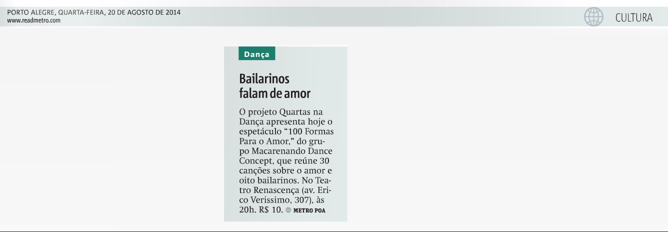Após a estreia em curta temporada no Teatro Renascença, que rendeu nove indicações e dois prêmios Açorianos de Dança em 2014, o espetáculo 100 Formas para o Amor volta a cartaz nos dias 08, 09 e 10 de maio, integrando a programação do 10º Festival Palco Giratório Sesc/POA no teatro do Centro Histórico-Cultural Santa Casa.