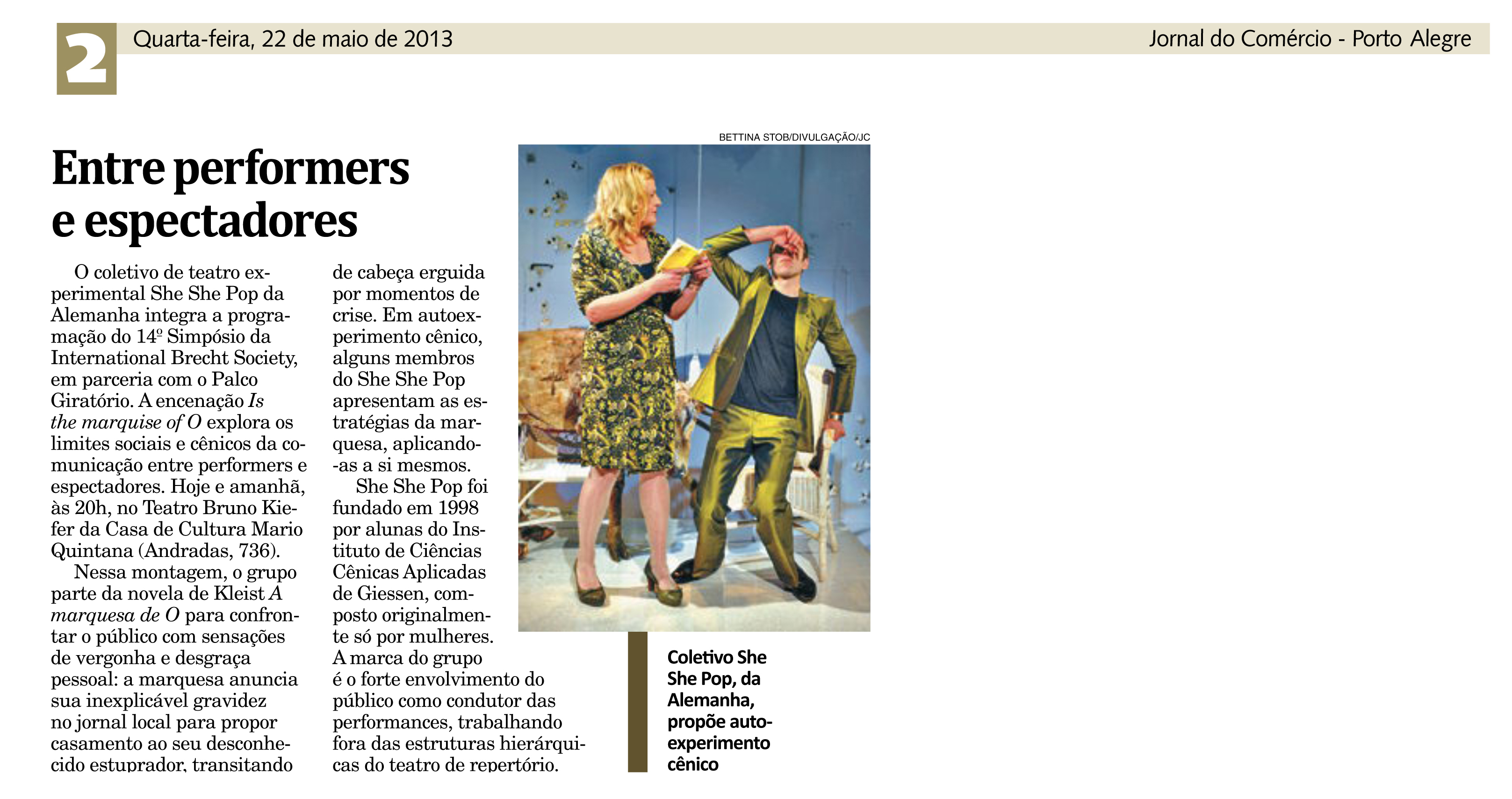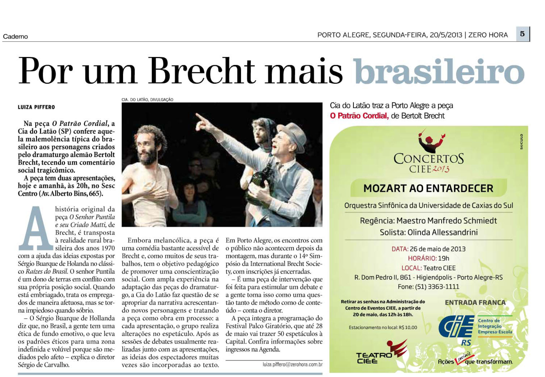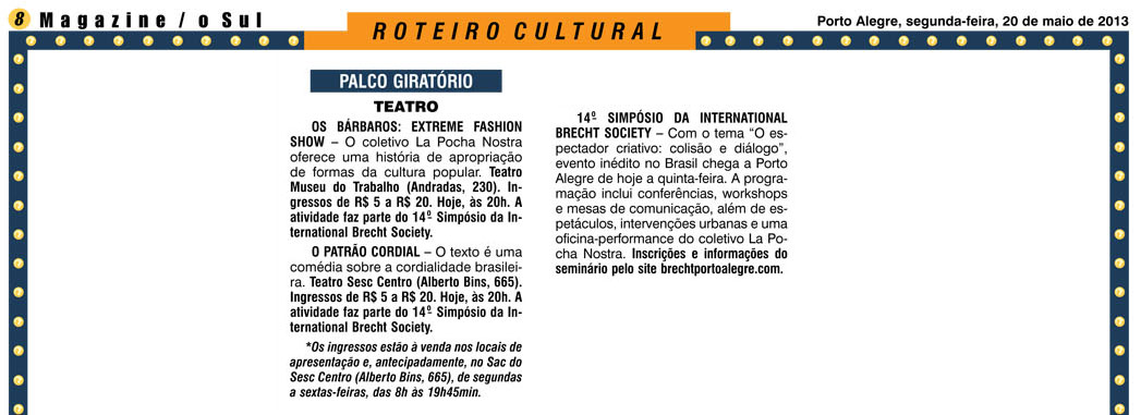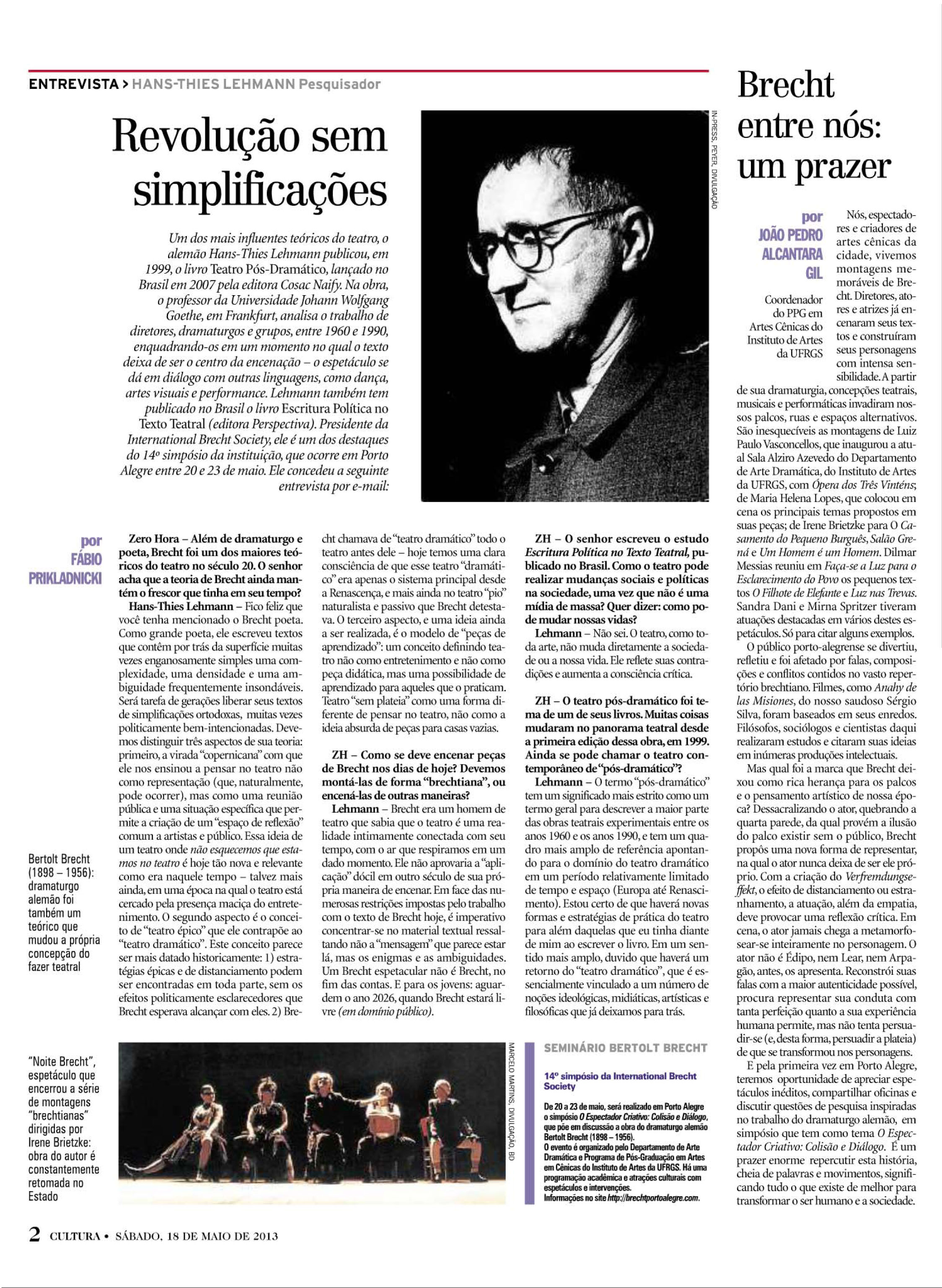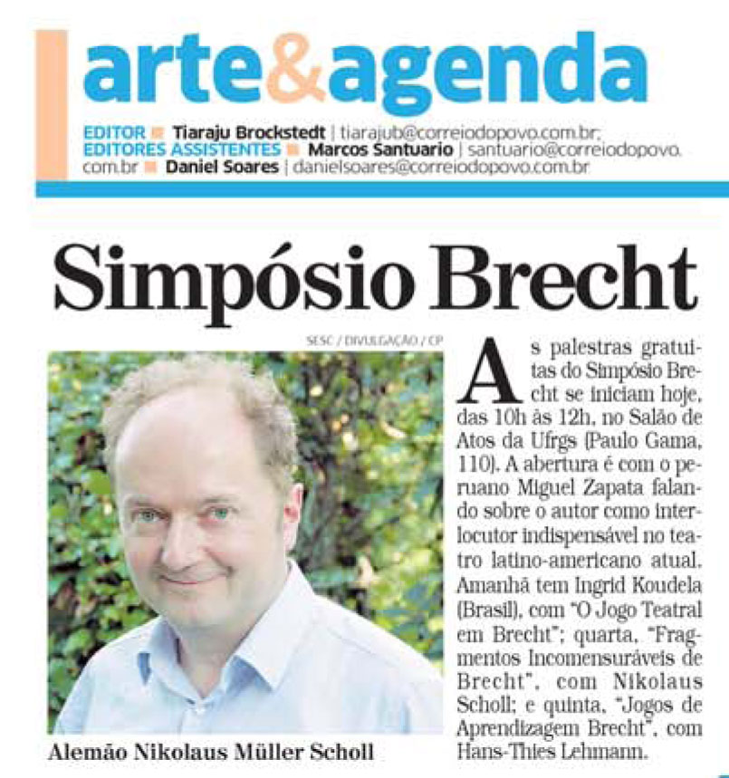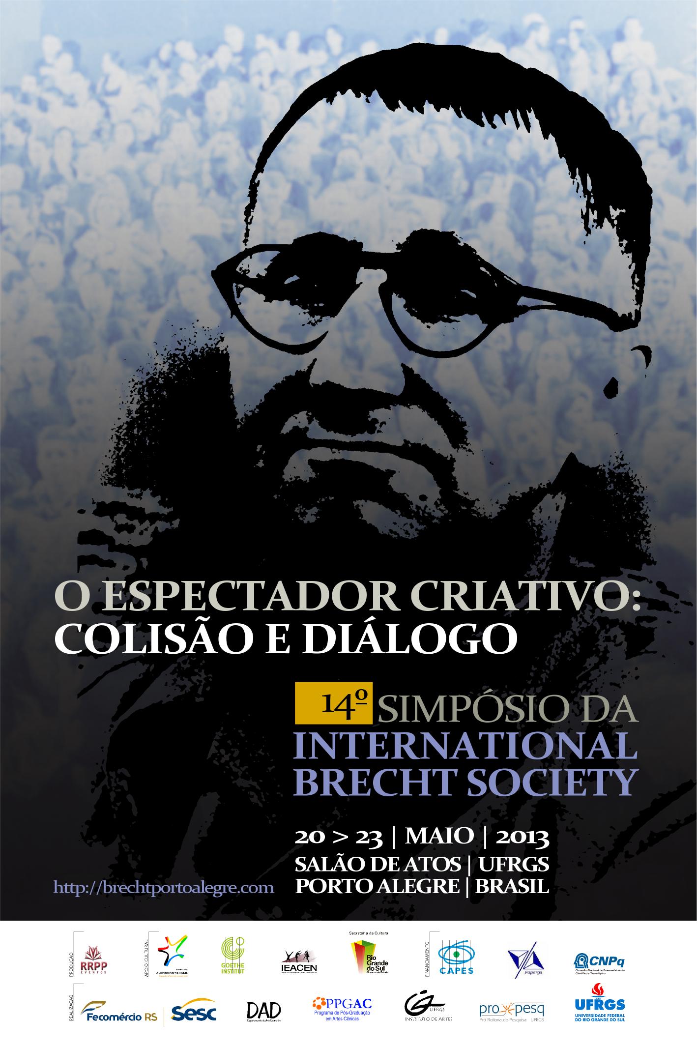 Porto Alegre recebe, pela primeira vez e no ano da Alemanha no Brasil, o 14º Simpósio da International Brecht Society, durante os dias 20 a 23 de maio, com o tema O Espectador Criativo: Colisão e Diálogo. O evento é organizado pelo Departamento de Arte Dramática e Programa de Pós-Graduação em Artes em Cênicas do Instituto de Artes da UFRGS, dividido em dois grandes setores: a programação acadêmica, que conta com o apoio do Instituto Goethe e do Governo do Estado do RS, e a programação cultural, promovida em parceria com o SESC – RS, com apoio do Ieacen.