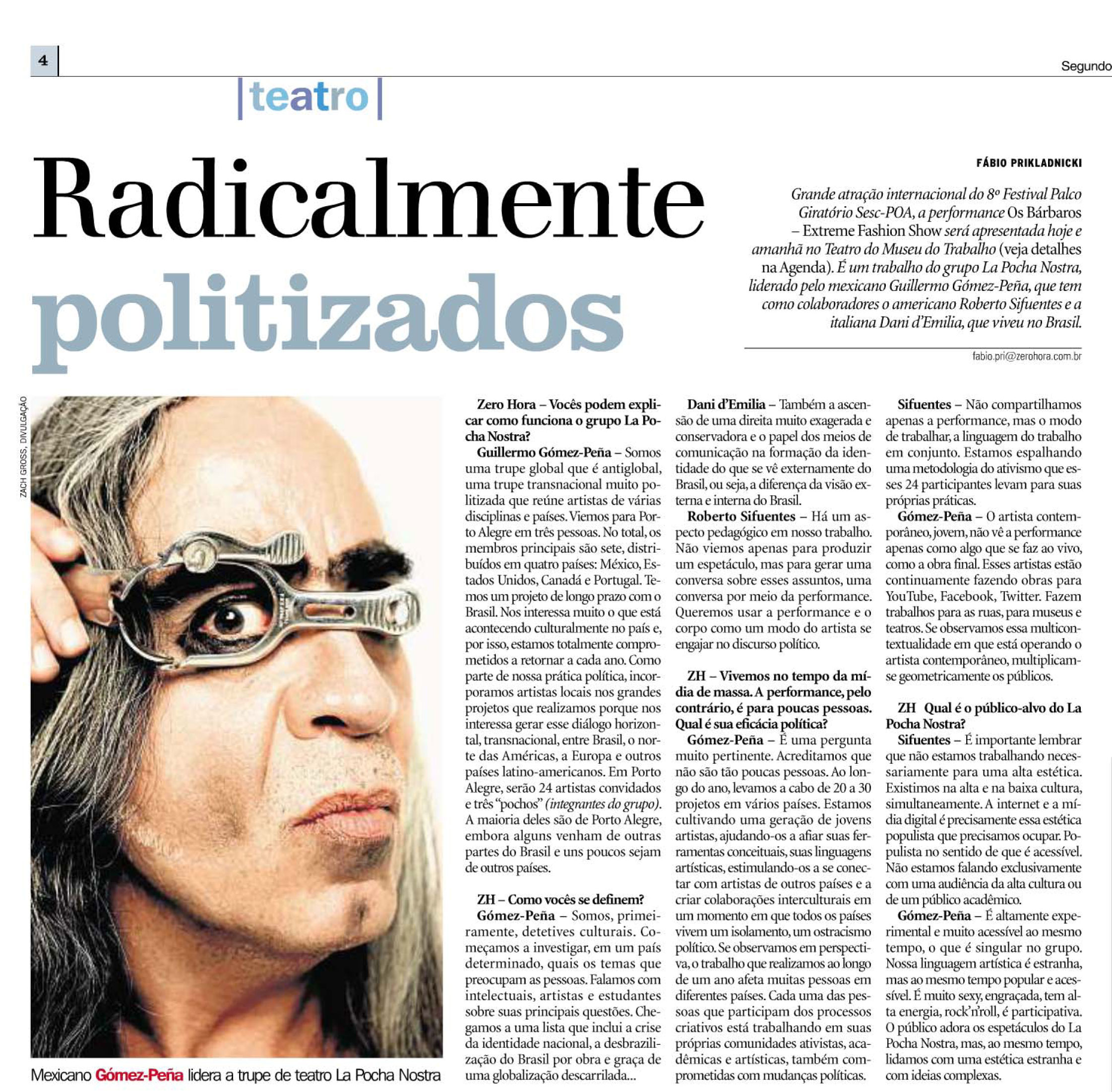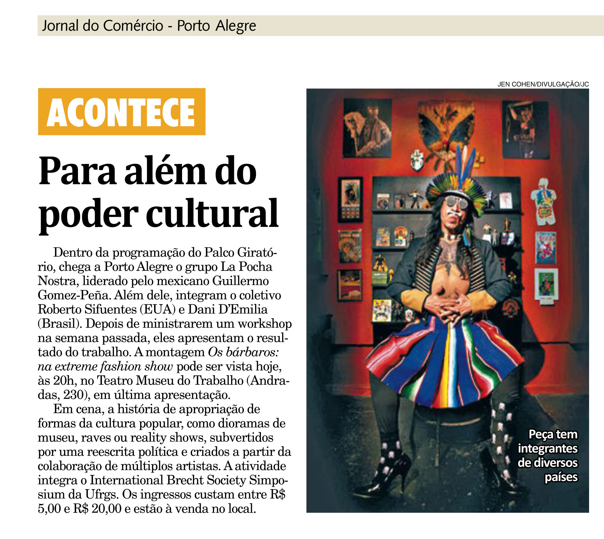 Durante a programação do Palco Giratório, quatro espetáculos integram o Simpósio: Os Bárbaros: Extreme Fashion Show do La Pocha Nostra, uma história de apropriação de formas da cultura popular como dioramas de museus, raves ou reality shows, subvertendo-as através de uma reescrita política; She She Pop is the Marquise of O, do coletivo de teatro experimental She She Pop da Alemanha, que se propõe a explorar os limites sociais e cênicos da comunicação entre performers e espectadores; O Patrão Cordial, da Cia do Latão, de São Paulo, uma comédia sobre a cordialidade brasileira que tem como ponto de partida o estudo Raízes do Brasil, Sérgio Buarque de Holanda, e a peça O senhor Puntila e seu criado Matti, do dramaturgo alemão Bertolt Brecht; e a performance Todo Mundo pode ser Brecht!, do Coletivo de Performance Heróis do Cotidiano, também de São Paulo. Vestidos de super-heróis e acompanhados por um cineasta, os performers do Coletivo andarão pelas ruas de Porto Alegre com malas cheias de figurinos, maquiagem, material cenográfico e panfletos que contêm poemas e trechos de textos teatrais de Brecht. Durante o passeio, os Heróis abordam os transeuntes e propõem a eles que representem teatralmente os textos de Brecht, escolhendo figurino, maquiagem e cenografia da leitura, dando uma interpretação pessoal ao texto e tecendo comentários sobre o mesmo.