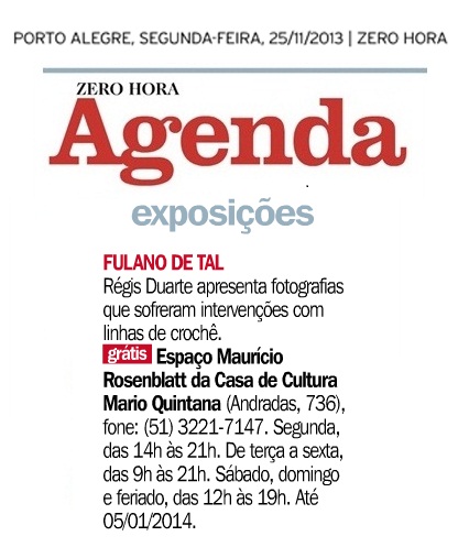 Inauguram no dia 21 de novembro, na Casa de Cultura Mario Quintana, duas exposições com a assinatura da equipe do Barraco Estúdio. Régis Duarte retorna às telas com a exposição Fulano de Tal, produção recente do artista, que ele classifica como um trabalho contemplativo, onde interfere em fotografias com linhas de crochê. “Os crochês dos detalhes, não são da vovó, foram feitos, um a um, por minha mãe”, revela. Duarte, que leva seu nome numa linha de vestuário há 10 anos, começou sua carreira pintando telas com tinta acrílica e fez sua primeira individual no ano de 1994 na reabertura da Casa de Cultura Mario Quintana.