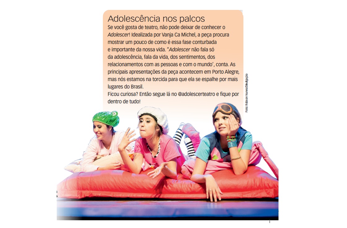 A dramaturgia de Vanja Ca Michel, que assina o roteiro, produção e direção, reflete sobre os comportamentos típicos da adolescência, reunindo fragmentos de Moacyr Scliar, do psiquiatra José Outeiral e dos psicanalistas Rubem Alves e Cybelle Weinberg. Temas recorrentes aos adolescentes, como respeito às diferenças, relação com os pais, bullying, sexualidade e drogas estão sempre em pauta nas esquetes que compõem o espetáculo.