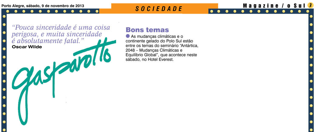 Porto Alegre, 18 de novembro de 2013 – O Concurso de Artigos do Seminário Antártica, 2048 – Mudanças Climáticas e Equilíbrio Global está com inscrições prorrogadas até o dia 24 de novembro. O evento, que ocorreu no dia 09 de novembro, em Porto Alegre, premiará os três melhores trabalhos.