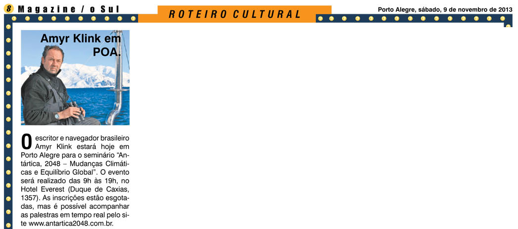 Porto Alegre, 12 de março de 2014 – O seminário Antártica, 2048 – Mudanças Climáticas e Equilíbrio Global, realizado na capital gaúcha no final de 2013, originou uma publicação que leva o mesmo nome. Trata-se de um inédito painel das questões da Antártica e como elas se entrelaçam com o equilíbrio do planeta, por meio da reprodução de palestras de especialistas que participaram do encontro. O lançamento, com sessão de autógrafos, acontece em Porto Alegre, em 18 /3, às 18h30, na Usina do Gasômetro, aberto ao público.