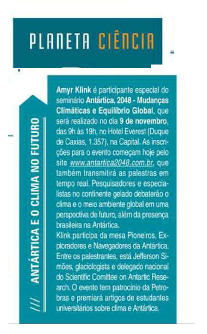 Inscrições (até 27 de outubro), demais informações, regulamento para Concurso de Artigos e transmissão ao vivo pelo site www.antartica2048.com.br