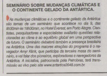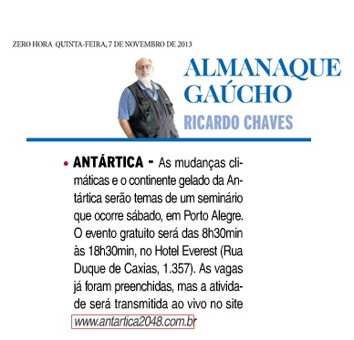Porto Alegre, 23 de outubro de 2013 – As mudanças climáticas e o continente gelado da Antártica são temas de seminário. O evento acontece dia 9 de novembro, das 8h30 às 18h30, no Hotel Everest, na capital gaúcha. Cientistas, pesquisadores e outros especialistas irão avaliar questões relacionadas ao clima e ao equilíbrio global em uma perspectiva de futuro. O seminário vai debater também a presença brasileira na Antártica. A iniciativa, patrocinada pela Petrobras, está com inscrições abertas até 27 de outubro pelo site www.antartica2048.com.br, mas quem não garantir seu lugar presencial pode acompanhar em tempo real pelo referido endereço eletrônico.