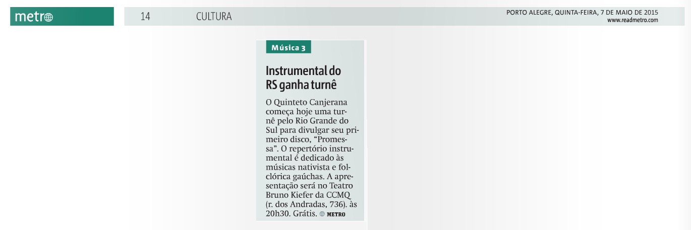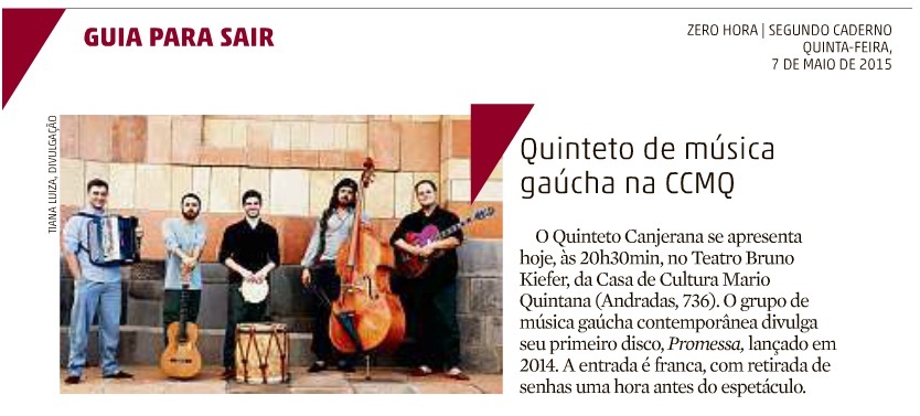 Inicia no dia 07 de maio, em Porto Alegre, a turnê por dez cidades do RS realizada pelo Quinteto Canjerana até o final deste ano, projeto financiado pelo Pró-Cultura LIC-RS. O grupo de música gaucha contemporânea divulga seu primeiro disco, Promessa, lançado em 2014.