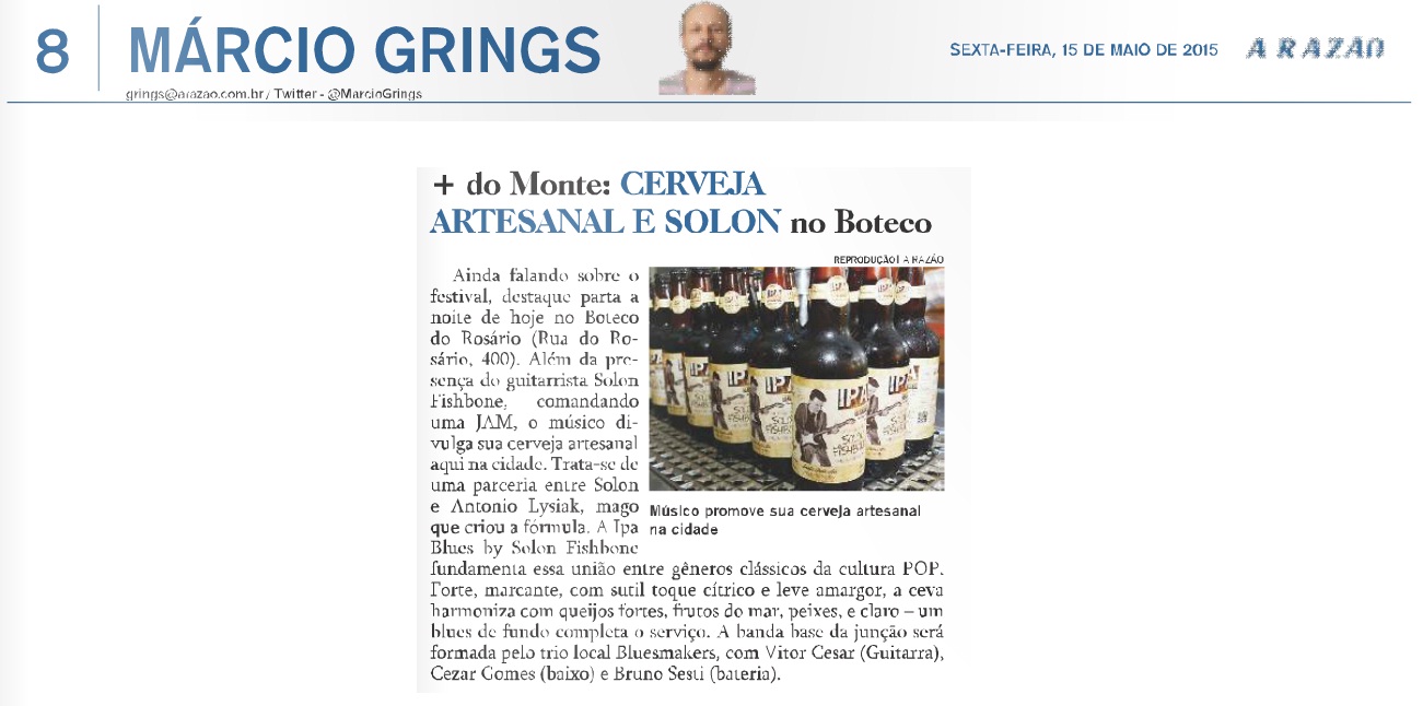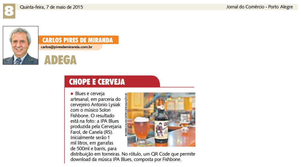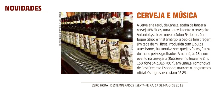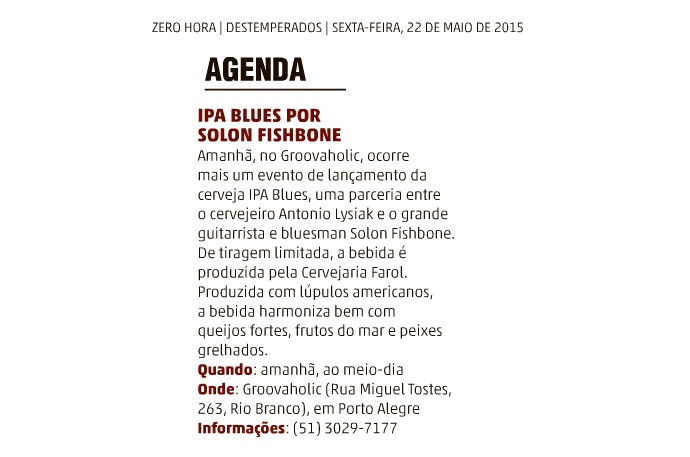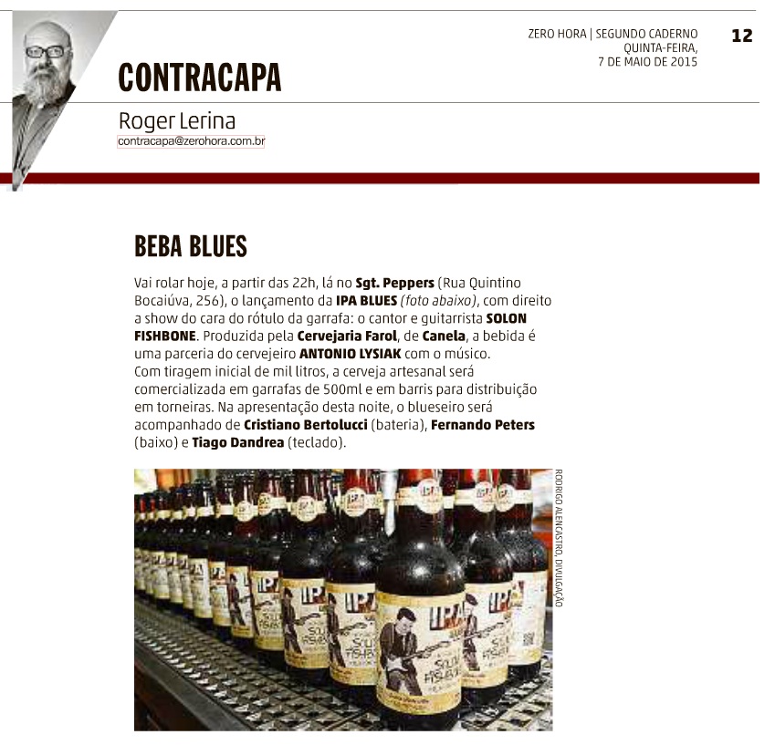 A partir de maio, os fãs de Blues e de cerveja artesanal poderão conhecer a união entre esses dois gêneros clássicos da música e da popular bebida: a IPA Blues by Solon Fishbone, produzida pela Cervejaria Farol, de Canela, RS.Resultado da parceria do cervejeiro Antonio Lysiak e do músico Solon Fishbone, a IPA Blues tem tiragem inicial de mil litros e será comercializada em garrafas de 500ml e barris para distribuição em torneiras.
