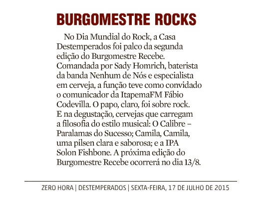 No dia 02 de maio, às 15h, o público poderá conferir o lançamento da cerveja em evento no Biergarten da cervejaria, com degustação da bebida e shows da banda Instrumental Best Dream e de Solon Fishbone. Os ingressos custam R$ 25,00. Mais informações: (54) 3282 7007.