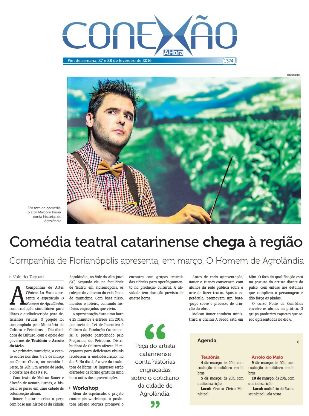 A La Vaca Companhia de Artes Cênicas, de Florianópolis, chega ao RS no mês de março para turnê por Teutônia e Arroio do Meio patrocinada pelo Programa Petrobras Distribuidora de Cultura para oficinas e apresentações do espetáculo “O Homem de Agrolândia”, escrito e atuado por Malcon Bauer e dirigido por Renato Turnes.