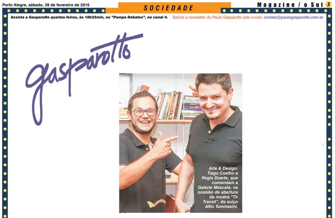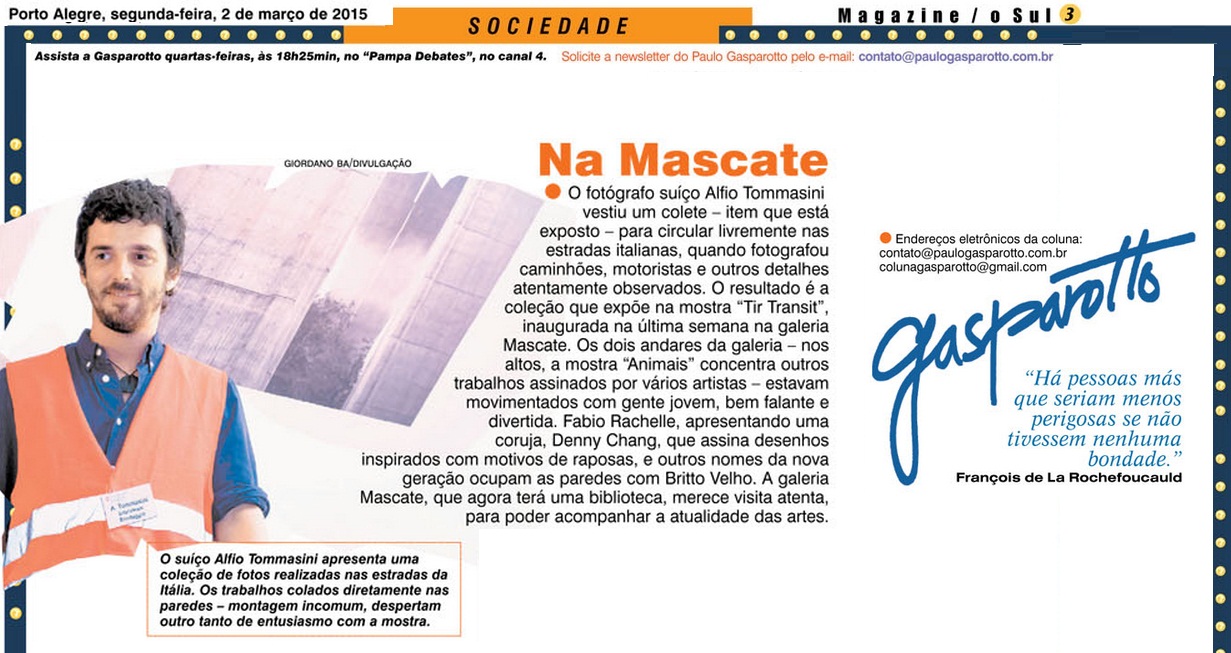 Inauguram no dia 24 de fevereiro às 19h as duas novas exposições da Galeria Mascate. “Tir Transit” é um registro de um trabalho de pesquisa de monitoramento de dados de tráfego desenvolvido na fronteira da Suíça com a Itália durante 2014.