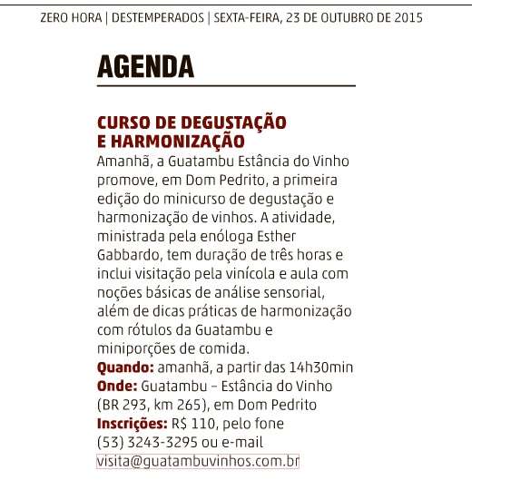 No dia 21 de janeiro a vinícola Guatambu iniciou a colheita das uvas Gewrüstraminer, abrindo a vindima da safra 2016. Já foram colhidas 15 toneladas de frutas, e a expectativa é um total de 17 toneladas de uvas brancas e 20 para tintas. A produção, em comparação com 2015, será 70% menor, devido as alterações no clima que prejudicaram os vinhedos. Segundo Gabriela Hermann Pötter, sócia-proprietária e enóloga da Guatambu, três fenômenos climáticos atingiram negativamente a produção: uma geada no final do mês de setembro, que ocorreu após um período de altas temperaturas que haviam estimulado o maior desenvolvimento das brotações precocemente, além de chuvas de granizo e o El Niño. “Apesar de todas as dificuldades em relação ao clima, as uvas estão com excelente qualidade, com bagas pequenas e mais concentradas. As uvas para espumantes estão com relação pH e acidez excelentes. Será difícil para o produtor, devido a pequena produção, mas o resultado na taça deliciará o consumidor”, afirma.