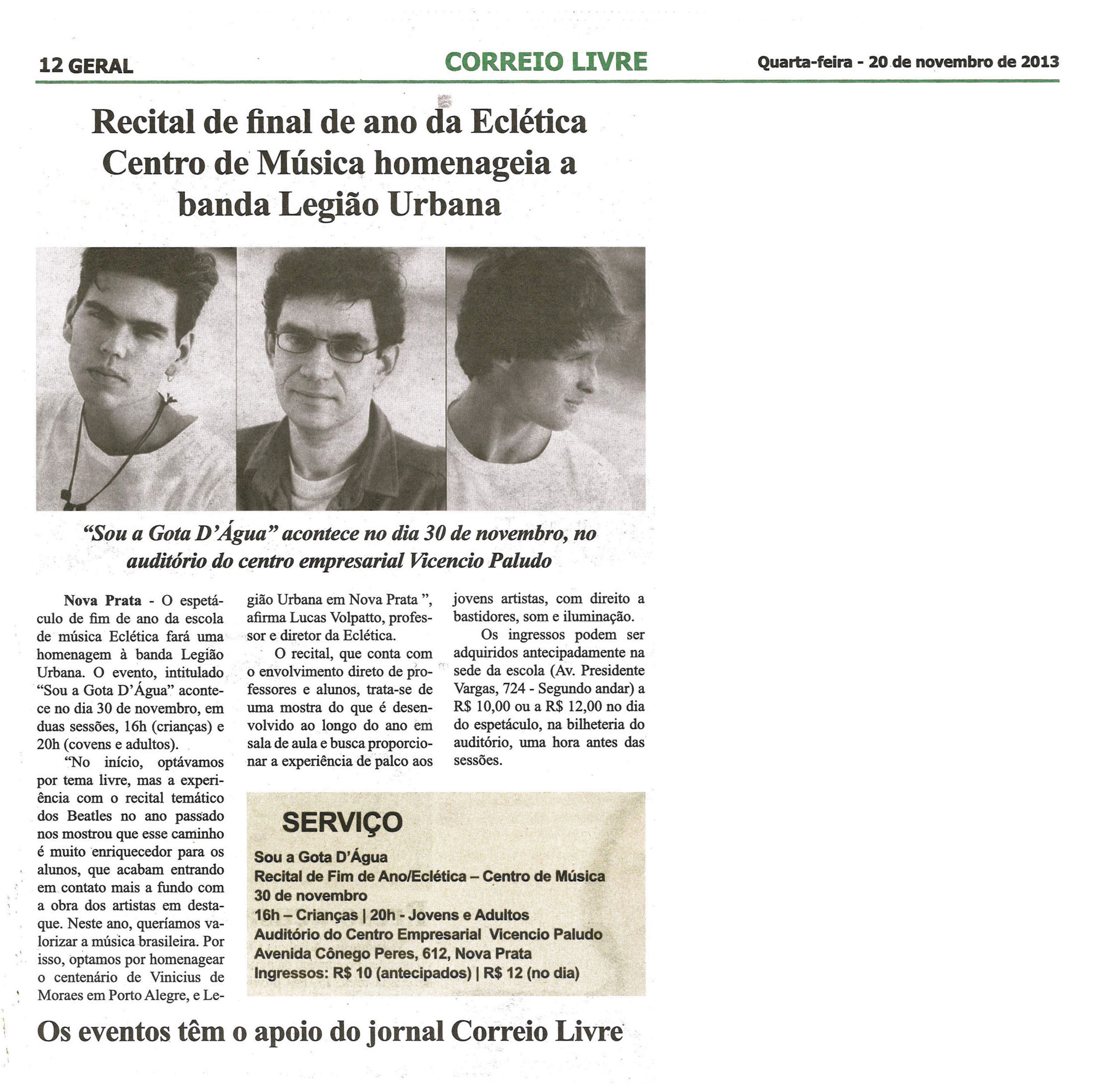 O espetáculo de fim de ano da escola de música Eclética fará uma homenagem à banda Legião Urbana. O evento, intitulado “Sou a Gota D’Água” acontece no dia 30 de novembro, em duas sessões, 16h (Crianças) e 20h (Jovens e Adultos).