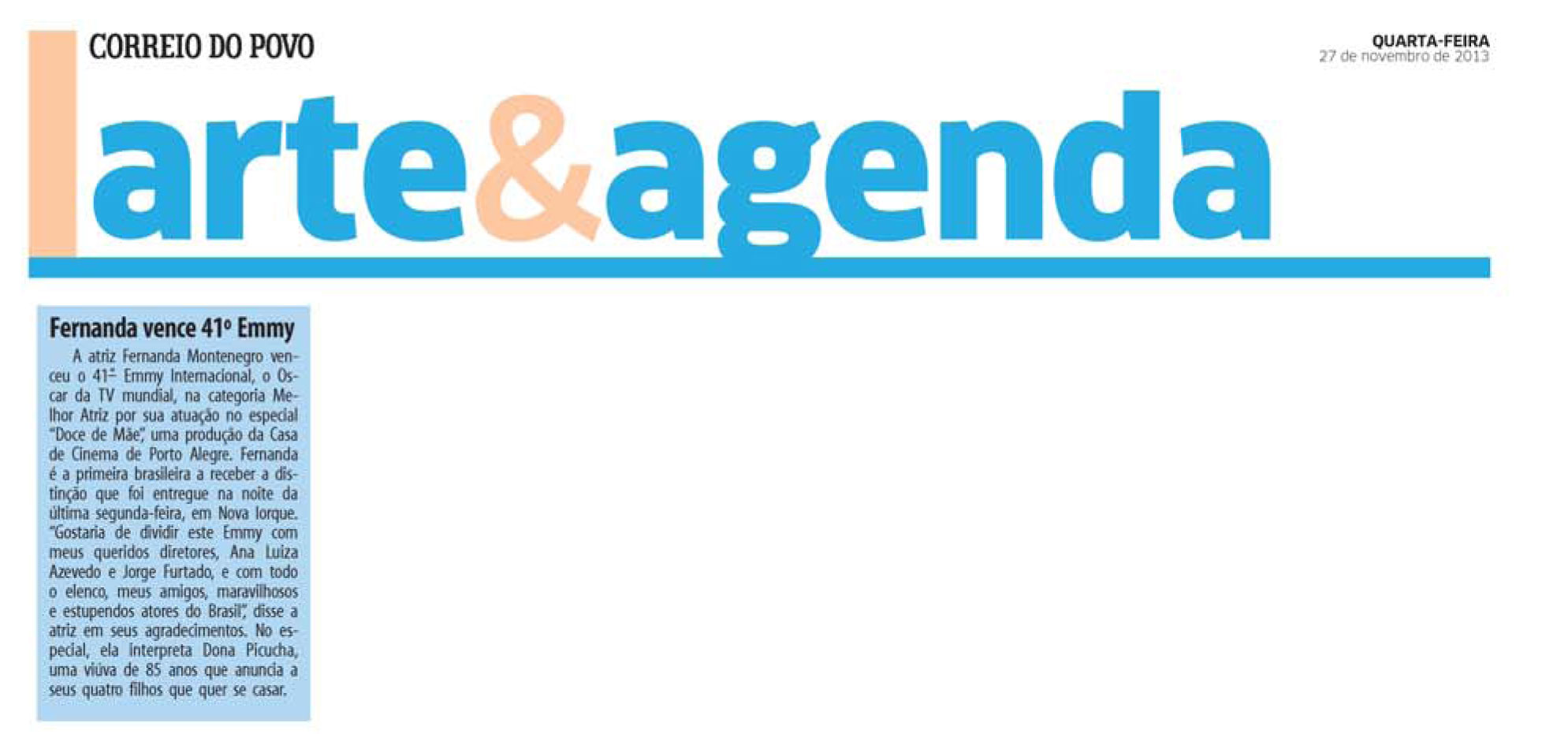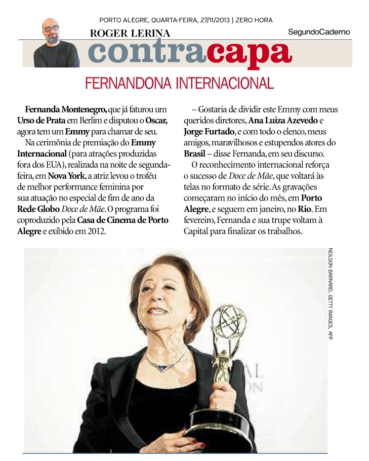 A série Doce de Mãe, uma co-produção da Casa de Cinema de Porto Alegre com a TV Globo, recebeu na noite de segunda-feira, 23 de novembro, o Emmy Internacional na categoria Melhor Comédia.