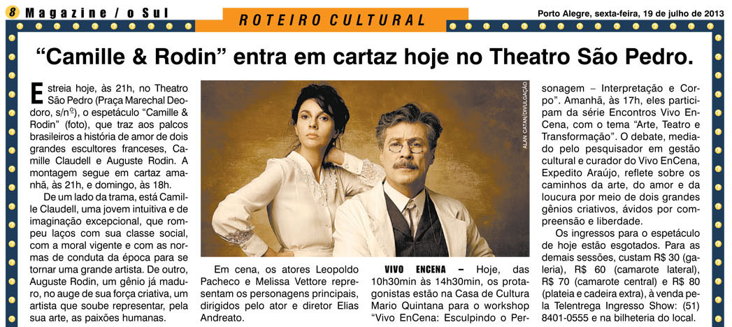 No do dia 29 de março, acontece a primeira edição de 2014 da série “Encontros Vivo EnCena” em Porto Alegre, que conta com a participação do elenco a partir do tema “Teatro e Transformação”, com mediação de Expedito Araújo, curador artístico do Vivo EnCena.