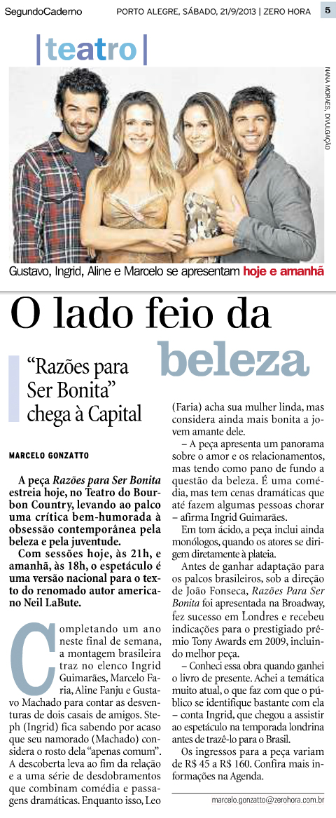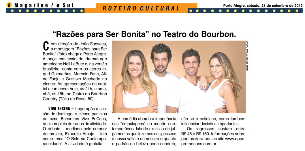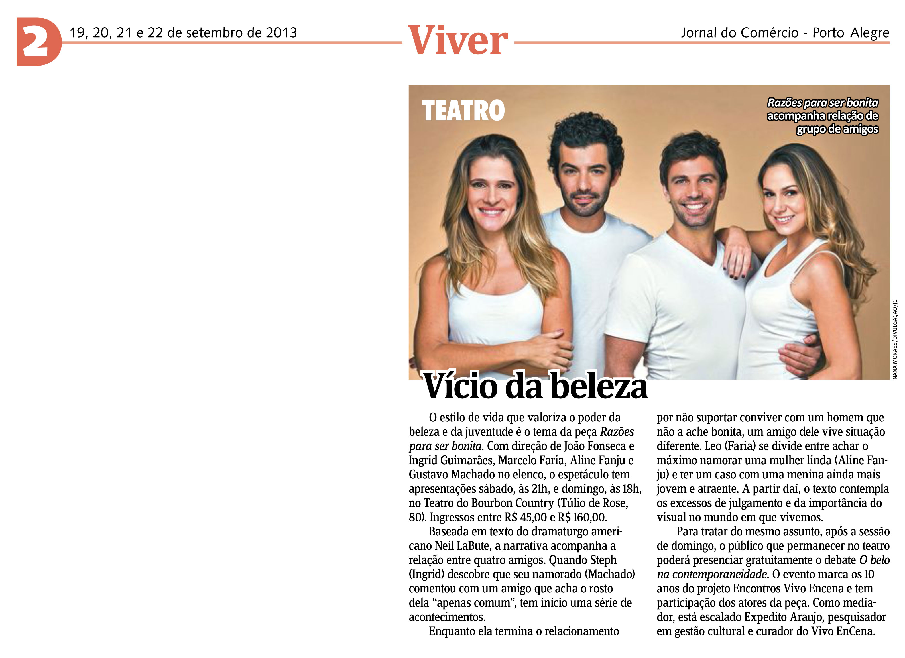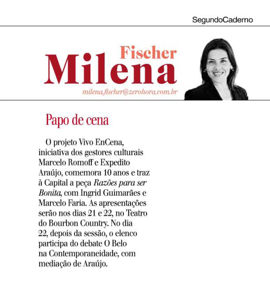 Após apresentação do espetáculo Razões para ser Bonita no dia 22 de setembro, no Teatro do Bourbon Country, os atores Ingrid Guimarães, Marcelo Faria, Gustavo Machado e Aline Fanju participam da série Encontros Vivo EnCena. Com o tema O Belo na Contemporaneidade, o debate é mediado pelo pesquisador em gestão cultural e curador do Vivo EnCena, Expedito Araujo. O evento marca os dez anos do projeto.