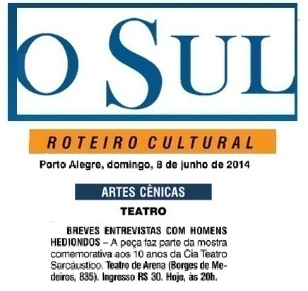 O Teatro Sarcáustico foi fundado em 2004 por formandos do curso de Artes Cênicas da UFRGS. Nestes 10 anos de trabalho continuado, o grupo criou espetáculos ousados e impactantes como os sucessos Wonderland e o que M. Jackson encontrou por lá (Prêmios Açorianos e Braskem em Cena de Melhor Espetáculo e Direção, dentre outros) e Breves Entrevistas com Homens Hediondos (Prêmio Braskem em Cena de Melhor Espetáculo). Em 2014, o Sarcáustico completou 10 anos de pesquisa continuada em artes cênicas, cujo trabalho vem se especializando em espetáculos realizados em espaços não-convencionais, com dramaturgias originais e atmosferas performáticas. O repertório conta com cinco espetáculos adultos, dois infantis, um projeto de performances urbanas e uma performance audiovisual-transmídia. O Teatro Sarcáustico atualmente é um dos grupos residentes do projeto “Usina das Artes” (PM Porto Alegre).