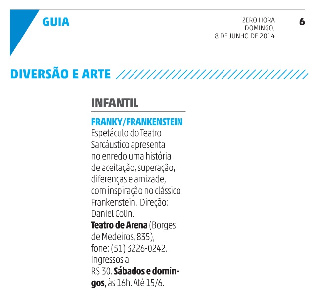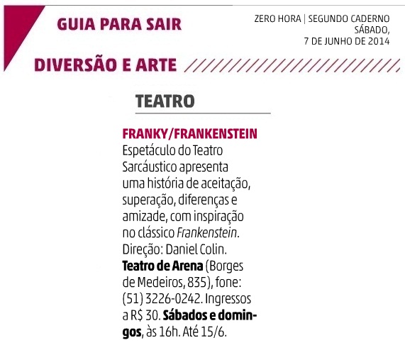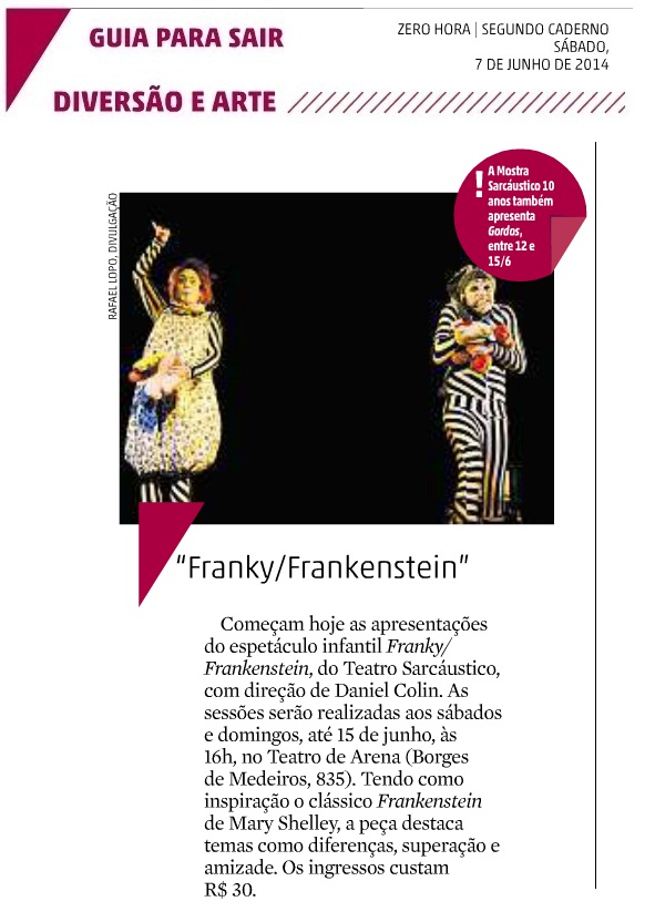 Desde 01 de junho, o Teatro Sarcáustico está circulando por escolas municipais de Porto Alegre promovendo o projeto “Formando Plateias com Franky/Frankenstein”. A companhia, que comemora 12 anos de pesquisa cênica em 2016, realiza apresentações pelas 17 regiões do Orçamento Participativo da cidade, ministrando oficinas para educadores e educandos, além de sessões do espetáculo, com entrada franca. As atividades têm financiamento do Fumproarte.