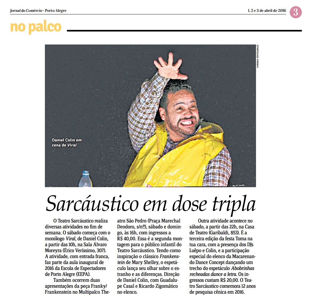 Para saber mais sobre o Teatro Sarcáustico, acesse: http://teatrosarcaustico.blogspot.com.br/