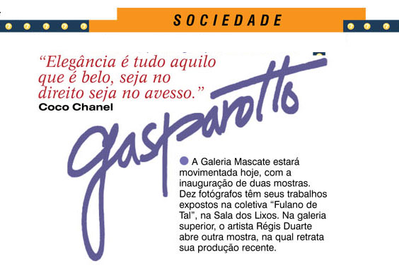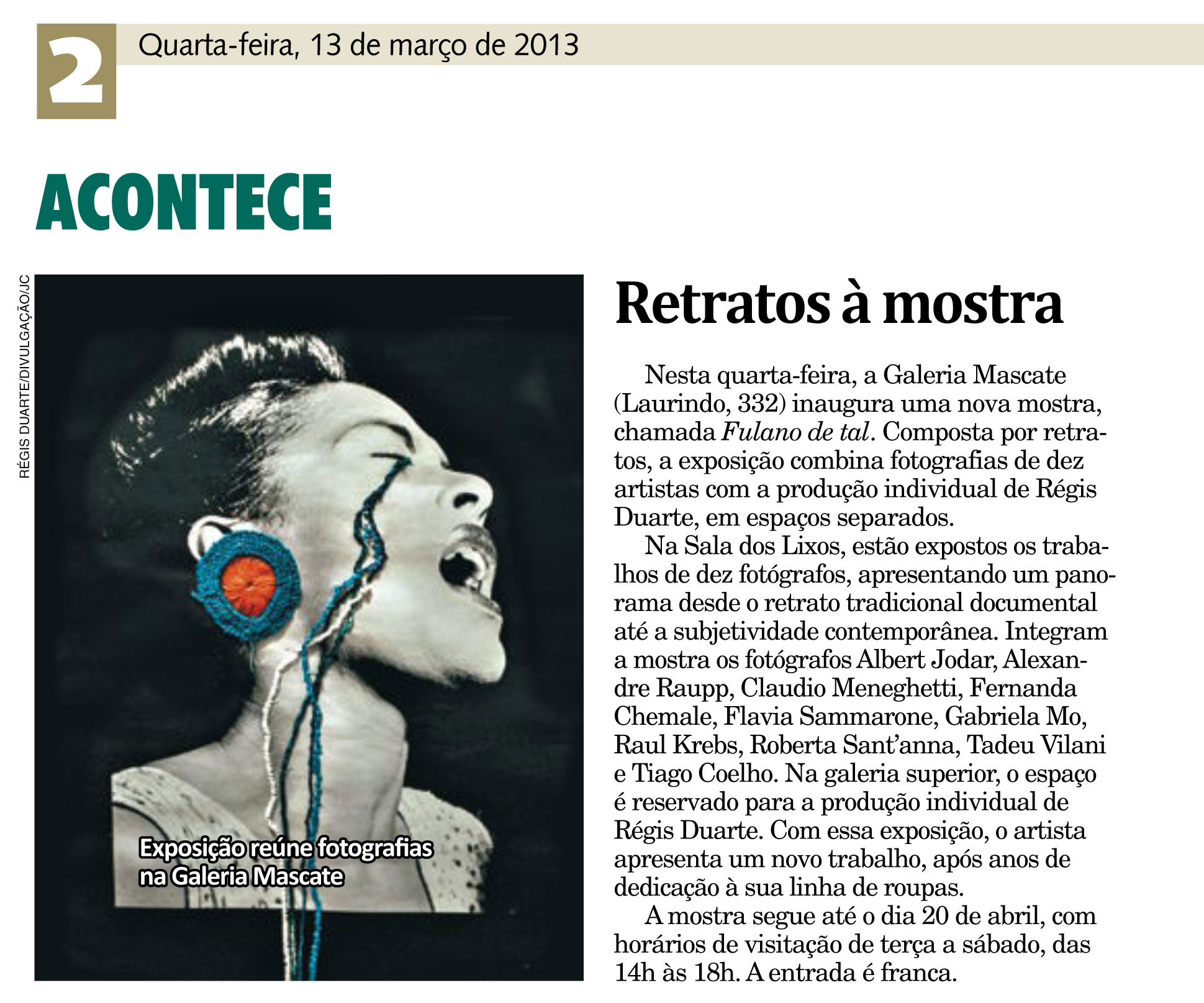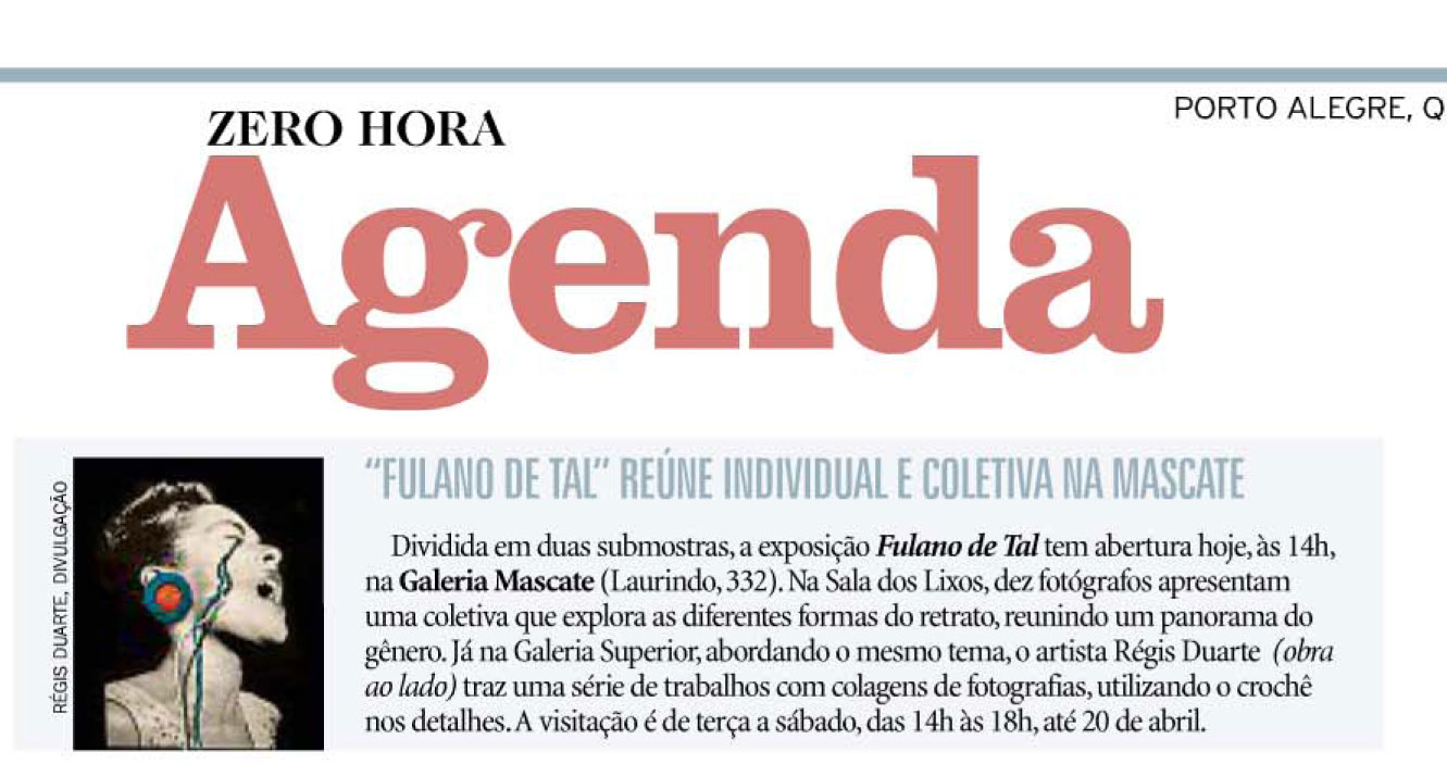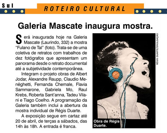 Inaugura no dia 13 de março a nova mostra na Galeria Mascate, intitulada Fulano de Tal. Na Sala dos Lixos, uma coletiva de retratos com trabalhos de dez fotógrafos apresentam um panorama desde o retrato tradicional documental até a subjetividade contemporânea.