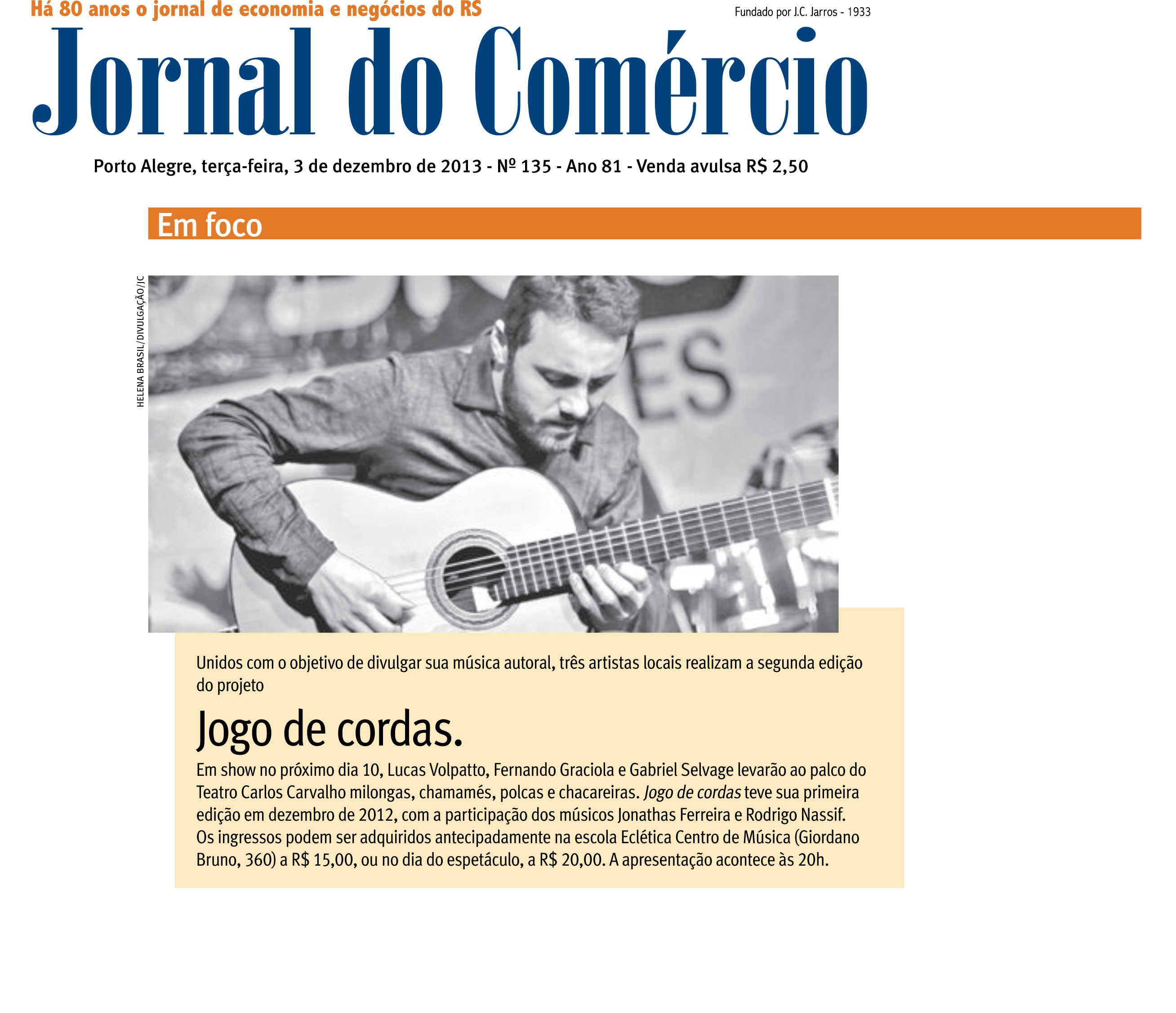 Três compositores com estilos distintos e um objetivo em comum: a reunião dos talentos de Lucas Volpatto, Fernando Graciola e Gabriel Selvage e a divulgação de sua música autoral. Esta é a proposta do projeto Jogo de Cordas, que tem sua segunda edição marcada para o dia 10 de dezembro, no Teatro Carlos Carvalho, na Casa de Cultura Mario Quintana. Os músicos apresentam suas canções que passam por milongas, chamamés, polcas e chacareras.