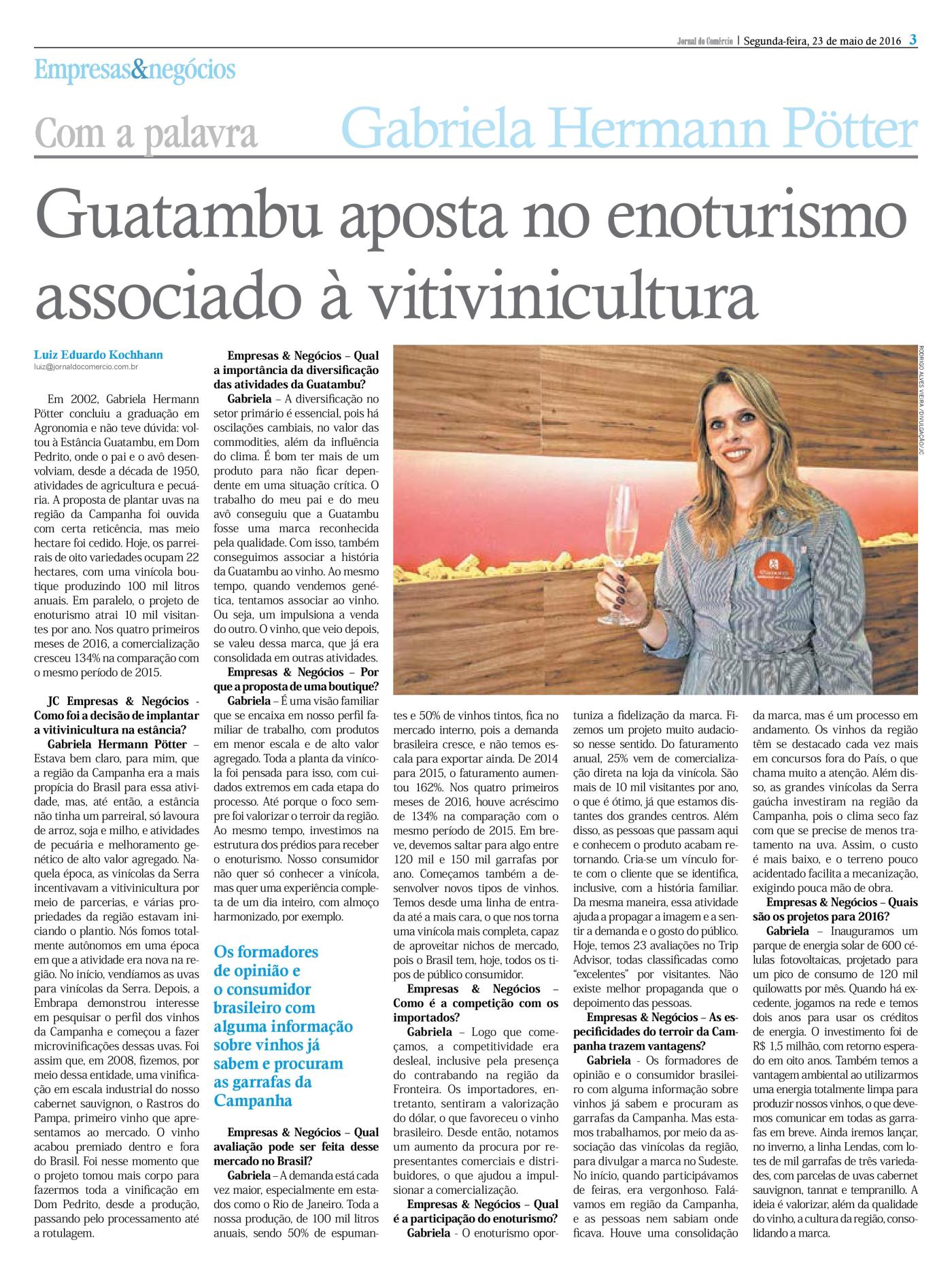 No dia 21 de janeiro a vinícola Guatambu iniciou a colheita das uvas Gewrüstraminer, abrindo a vindima da safra 2016. Já foram colhidas 15 toneladas de frutas, e a expectativa é um total de 17 toneladas de uvas brancas e 20 para tintas. A produção, em comparação com 2015, será 70% menor, devido as alterações no clima que prejudicaram os vinhedos. Segundo Gabriela Hermann Pötter, sócia-proprietária e enóloga da Guatambu, três fenômenos climáticos atingiram negativamente a produção: uma geada no final do mês de setembro, que ocorreu após um período de altas temperaturas que haviam estimulado o maior desenvolvimento das brotações precocemente, além de chuvas de granizo e o El Niño. “Apesar de todas as dificuldades em relação ao clima, as uvas estão com excelente qualidade, com bagas pequenas e mais concentradas. As uvas para espumantes estão com relação pH e acidez excelentes. Será difícil para o produtor, devido a pequena produção, mas o resultado na taça deliciará o consumidor”, afirma.