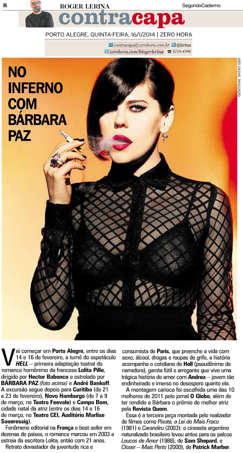Inicia por Porto Alegre a turnê pelo Rio Grande do Sul e Paraná, patrocinada pelo Programa Petrobras Distribuidora de Cultura, do espetáculo Hell, dirigido por Hector Babenco e estrelado por Bárbara Paz e André Bankoff. As apresentações da primeira adaptação teatral do romance de Lolita Pille acontecem nos dias 14, 15 e 16 de fevereiro, no Theatro São Pedro.