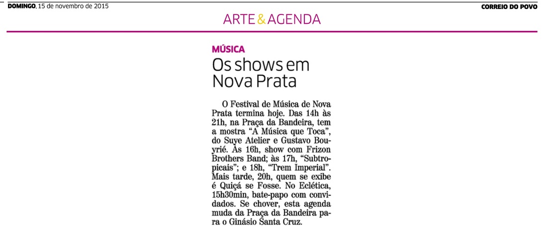 Os pratenses da Frizon Brothers Band iniciaram as apresentações do último dia de evento, seguidos por Subtropicais e Trem Imperial. A dupla Quiçá, Se Fosse, de Porto Alegre, encerrou a programação do evento. Volpatto comemora o sucesso da primeira edição, reforçando a importância dos patrocinadores e parceiros, que, mesmo em ano de crise financeira, tiveram a sensibilidade de enxergar uma realidade além de um projeto no papel e viabilizado o festival. “Foi emocionante ver a cidade mobilizada em torno da música. Poder proporcionar uma programação altamente qualificada e gratuita é um grande desafio e conseguimos cumpri-lo com ajuda do nosso patrocinador Adylnet Telecom e nossos apoiadores culturais Unimed Vale das Antas, P&C ArteMobili, Carla Franco Pediatria e Prefeitura de Nova Prata”.