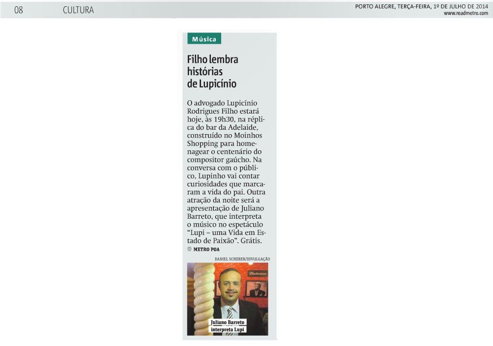 O espetáculo Lupi, o musical – uma vida em estado de paixão integra a programação do centenário de nascimento do compositor Lupicínio Rodrigues (nascido em 16 de setembro de 1914). Com Direção Musical de Mathias Pinto, a montagem apresenta 21 músicas selecionadas do extenso repertório de Lupi, reverenciado no Brasil, como um de seus poetas/compositores mais fecundos. De suas 600 composições, ao menos 150 foram gravadas, de Caetano Veloso a Jamelão. A montagem, dirigida por Arthur José Pinto, estreou no Theatro São Pedro no dia 31 de maio.