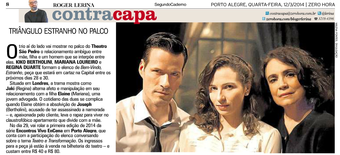 No do dia 29 de março, acontece a primeira edição de 2014 da série “Encontros Vivo EnCena” em Porto Alegre, que conta com a participação do elenco a partir do tema “Teatro e Transformação”, com mediação de Expedito Araújo, curador artístico do Vivo EnCena.