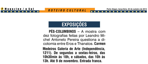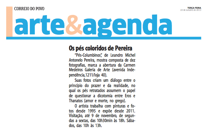 Inaugura no dia 22 de outubro a exposição “Pés-Columbinos” de Leandro Michel Antonelo Pereira. A mostra com dez fotografias marca a inauguração da Carmen Medeiros Galeria de Arte, na Av. Independência.