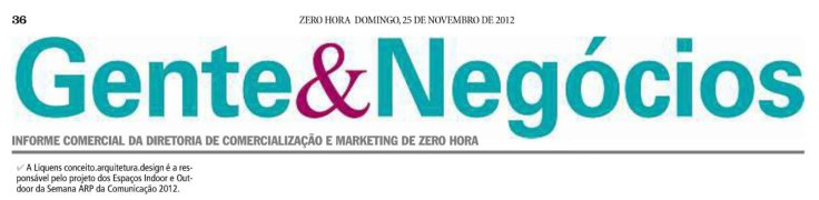 A Liquens conceito.arquitetura.design é responsável, pelo nono ano consecutivo, pelas intervenções urbanas e arquitetura indoor da Semana ARP da Comunicação, que acontece entre os dias 19 e 24 de novembro em Porto Alegre. A dupla de arquitetos Daniela Corso e Joel Fagundes ficou responsável pela concepção e montagem de sete espaços no bairro Moinhos de Vento, que contam com os cenários das palestras no Sheraton Hotel, Instituto Goethe e Constantino, Exposição da Prefeitura Municipal de Porto Alegre junto ao Monumento do Parcão, lounges e displays urbanos. Além da Parada de ônibus, na esquina da Av. Goethe com 24 de Outubro, uma instalação com andaimes e painéis ecológicos.