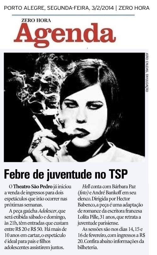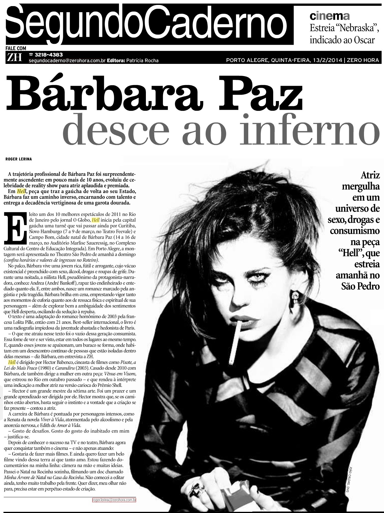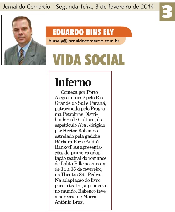 Encerra em Novo Hamburgo e Campo Bom a turnê pelo Rio Grande do Sul e Paraná, patrocinada pelo Programa Petrobras Distribuidora de Cultura, do espetáculo Hell, dirigido por Hector Babenco e estrelado por Bárbara Paz e André Bankoff. As apresentações da primeira adaptação teatral do romance de Lolita Pille acontecem nos dias 07, 08 e 09 de março no Teatro Feevale e nos dias 14, 15 e 16 no Teatro CEI.